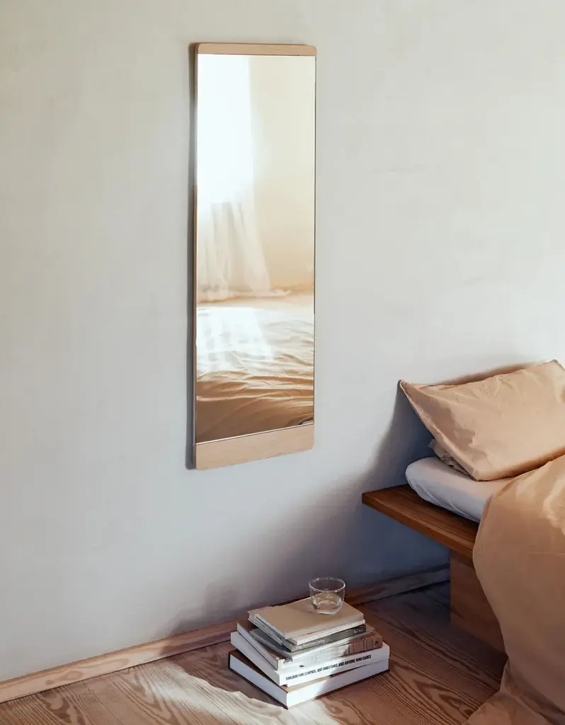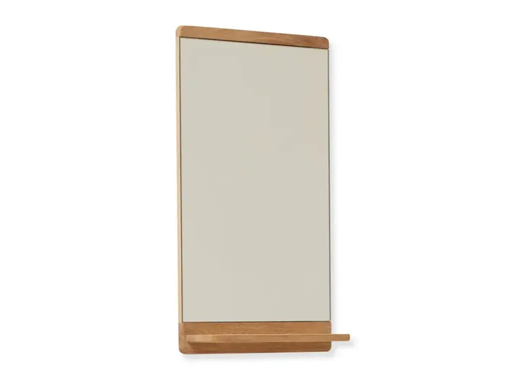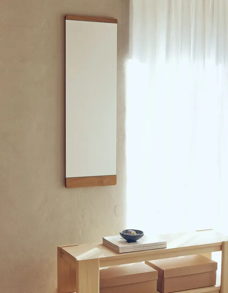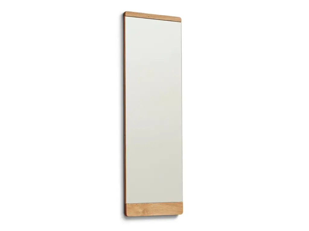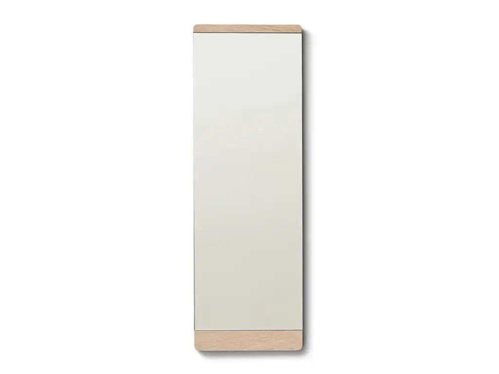 Rim is an elegant wall mirror with an oak frame and ‘infinity’ glass finish. This long wall mirror is both highly practical and incredibly sophisticated and will complement most modern living rooms, bathrooms, hallways or bedrooms."We wanted to make a classic and slim mirror with visible soft wooden details that lift it from the wall. The flat panels at the top and bottom give the mirror a warm expression as the wood grain becomes visible. The wooden strips that surround the back of the mirror all have a large radius which creates a soft shadow on the wall." – Herman Studio