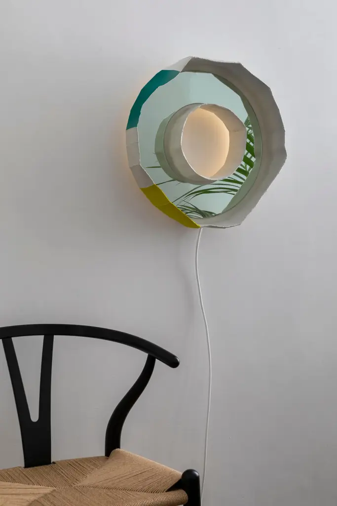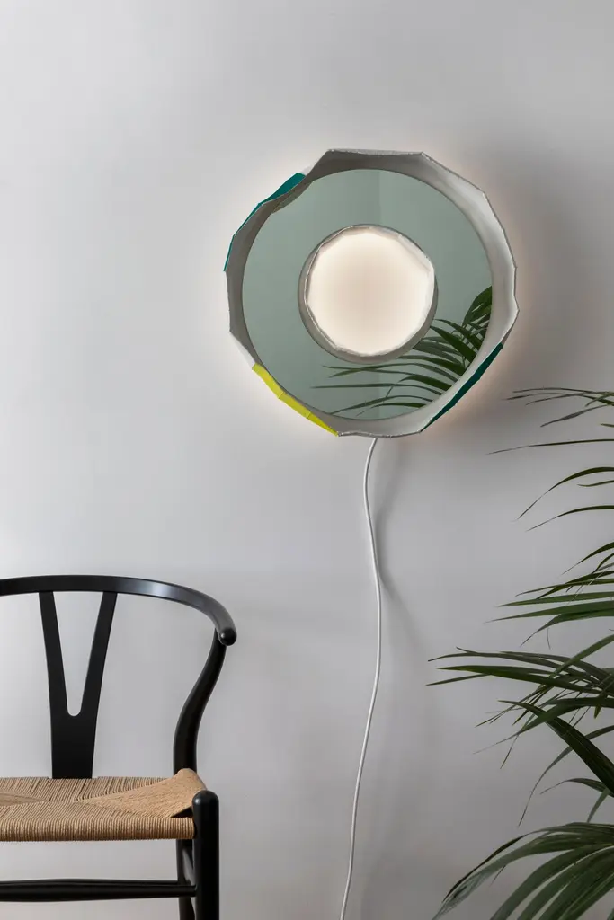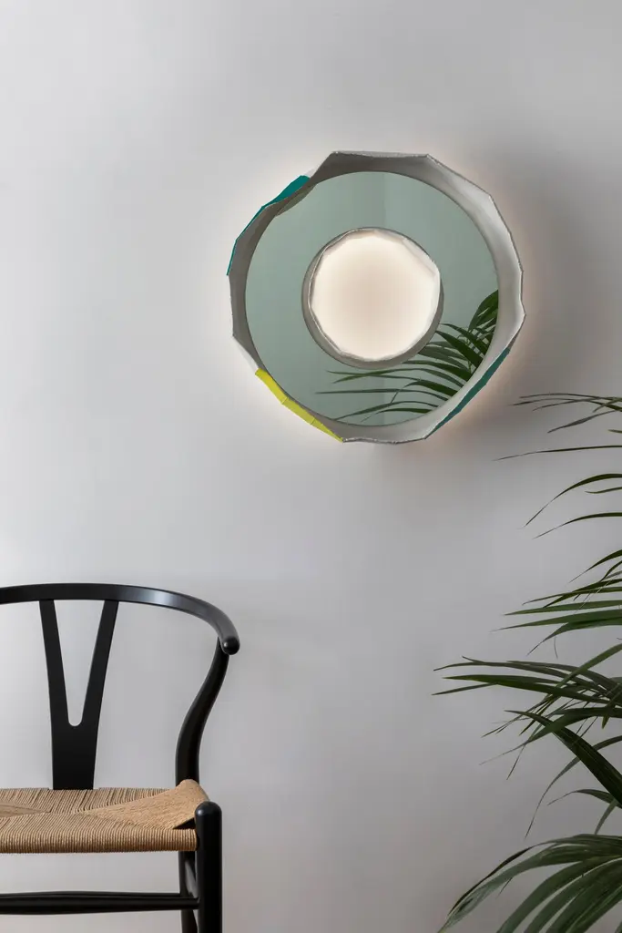 RING AURA, a stunning mirror-lamp handmade in Italy, one of 2 designs that make up the collection REFLECTIONS, the result of a collaboration between artist Paola Paronetto & designer Giovanni Botticelli, that integrates ceramic with colour, glass and light. REFLECTIONS, a fusion of distinctive materials developed by their creators, which combine thanks to their aptitude for colour and formal clarity. The features of an apparently light material such as paper clay harmonise with the crisp lines of the mirror, the result of specific processing, finishing of surfaces and colours, have a thoughtful and meticulous balance, but remain warm and delicate.The chromatic harmony is purposeful and unites the two materials seamlessly.Available with customizable silk cable or the applique version. 5 color options plus an extensive palette of colours for bespoke requests.