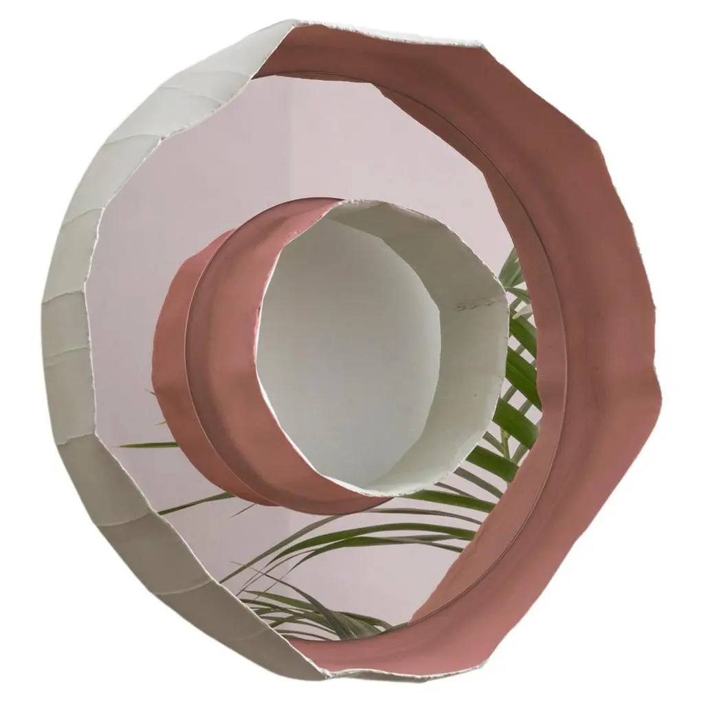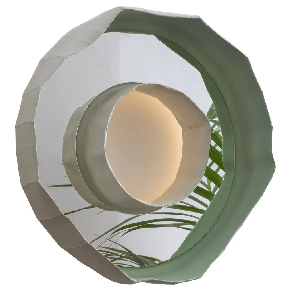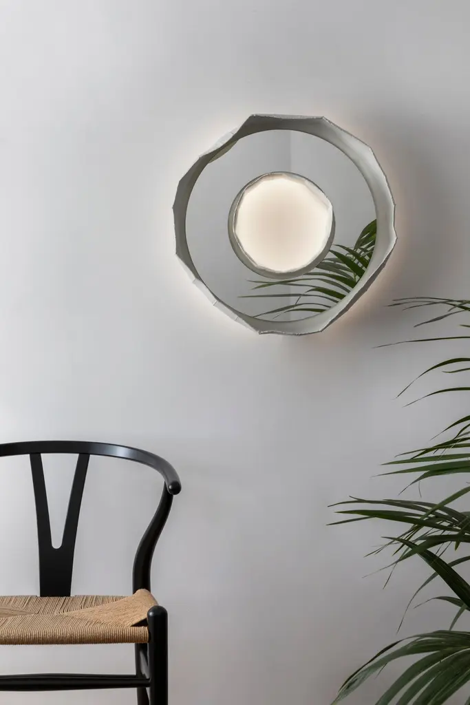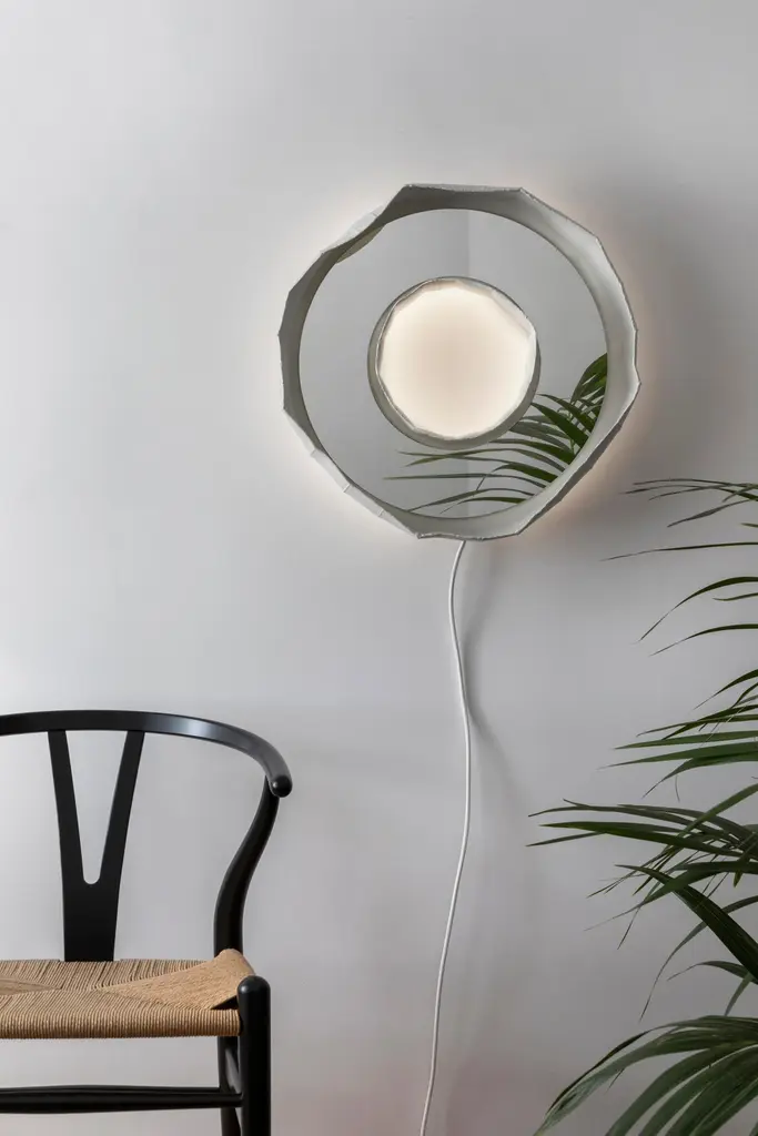 RING AURA, a stunning mirror-lamp handmade in Italy, one of 2 designs that make up the collection REFLECTIONS, the result of a collaboration between artist Paola Paronetto & designer Giovanni Botticelli, that integrates ceramic with colour, glass and light. REFLECTIONS, a fusion of distinctive materials developed by their creators, which combine thanks to their aptitude for colour and formal clarity. The features of an apparently light material such as paper clay harmonise with the crisp lines of the mirror, the result of specific processing, finishing of surfaces and colours, have a thoughtful and meticulous balance, but remain warm and delicate.The chromatic harmony is purposeful and unites the two materials seamlessly.Available with customizable silk cable or the applique version. 5 colour options plus an extensive palette of colours for bespoke requests.