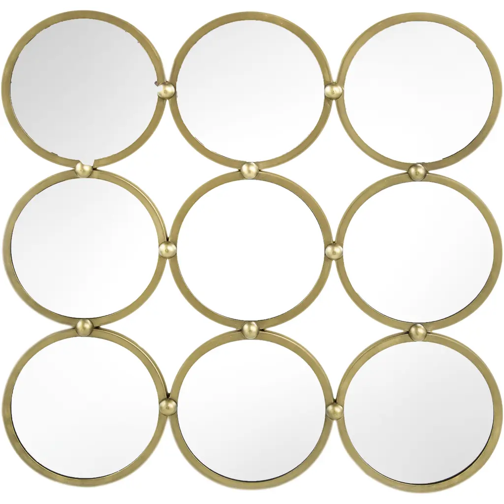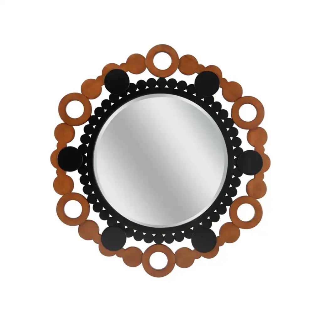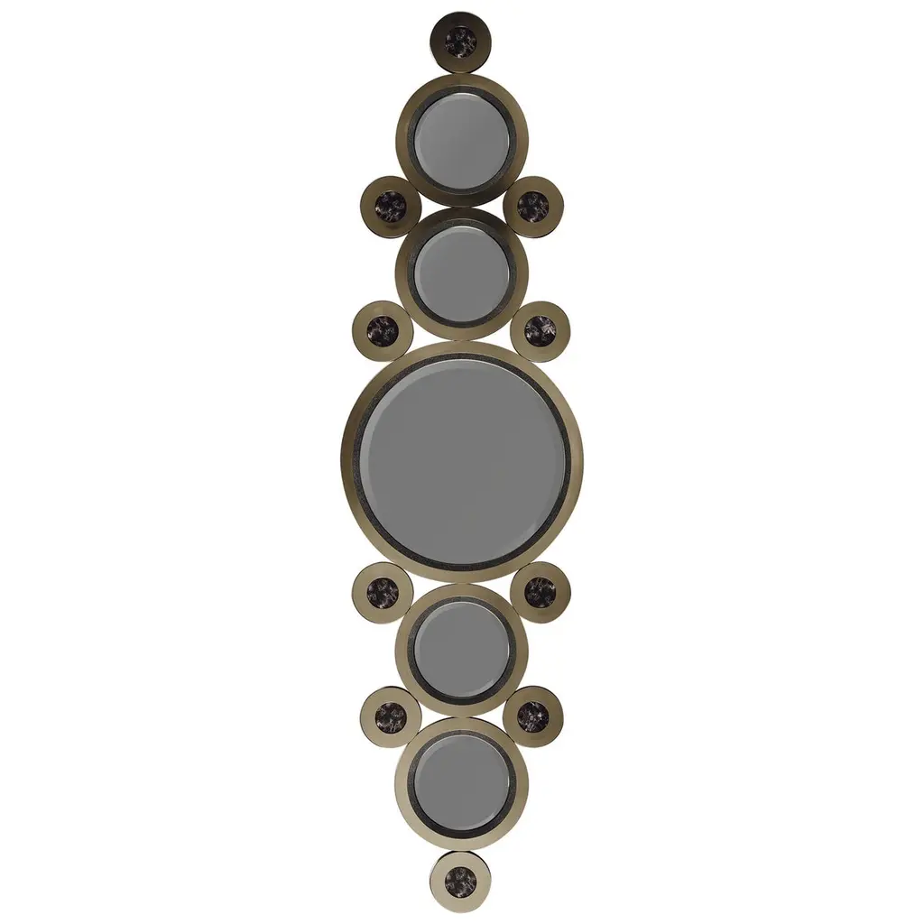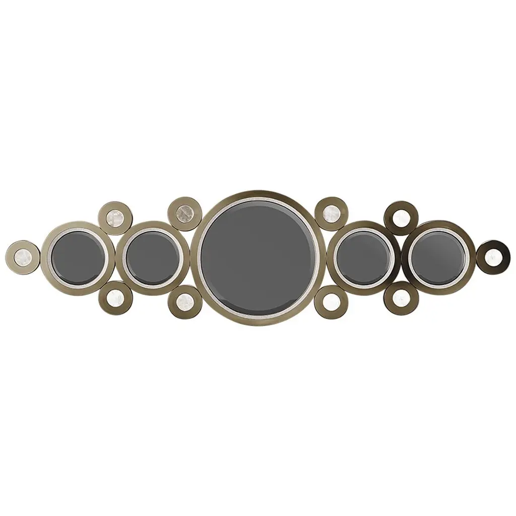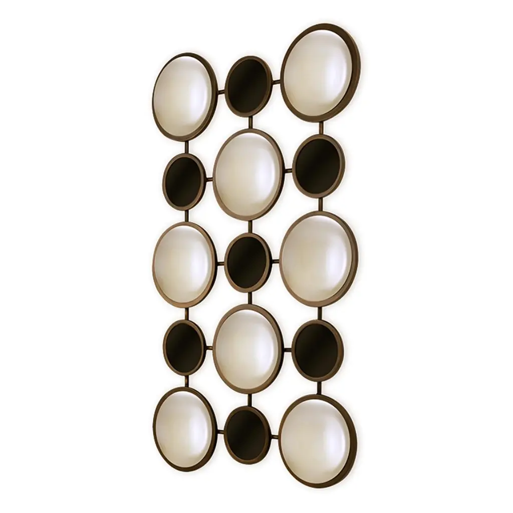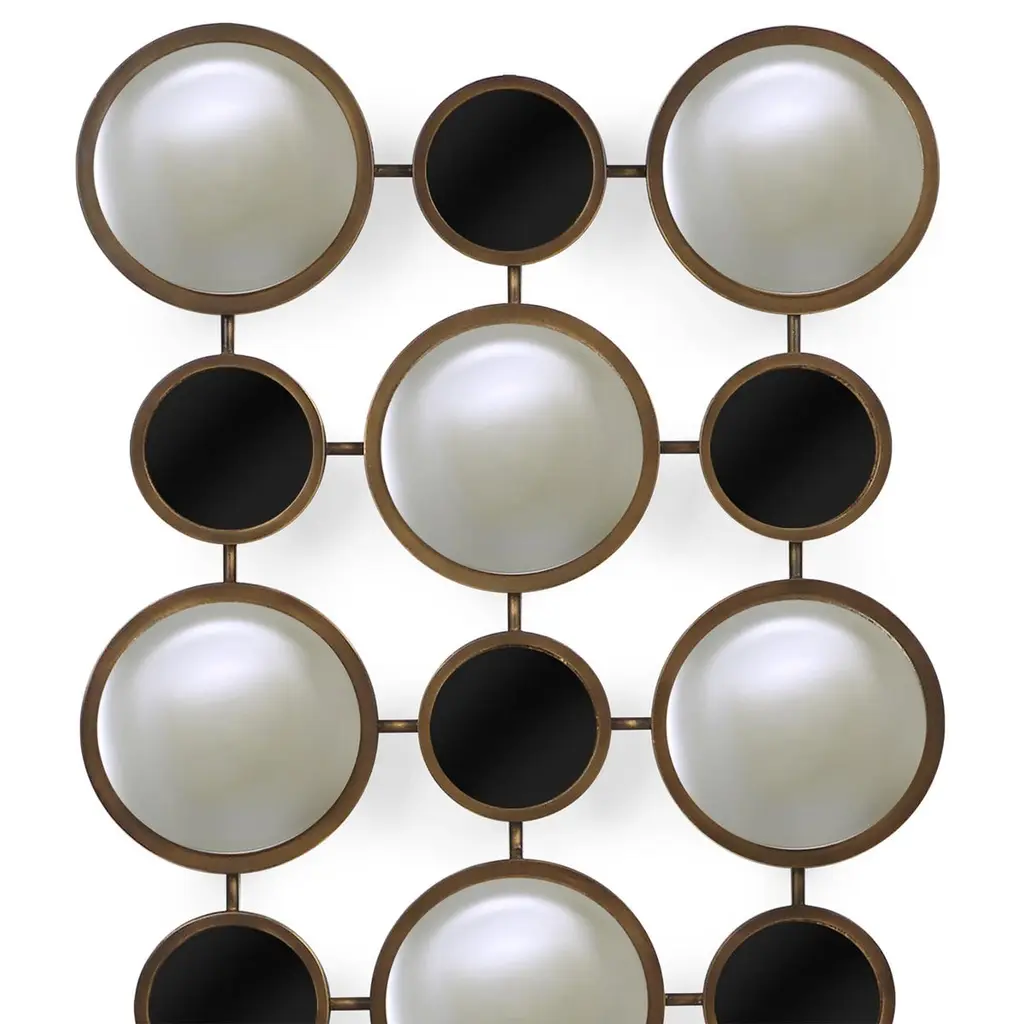 Mirror rings convex with metal frame inbronzage finish and with 8 convex mirrors.With 7 round black glass rounds.Also available with frame in gold leaf orsilver leaf finish.