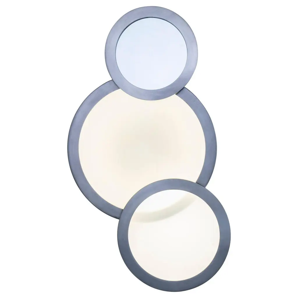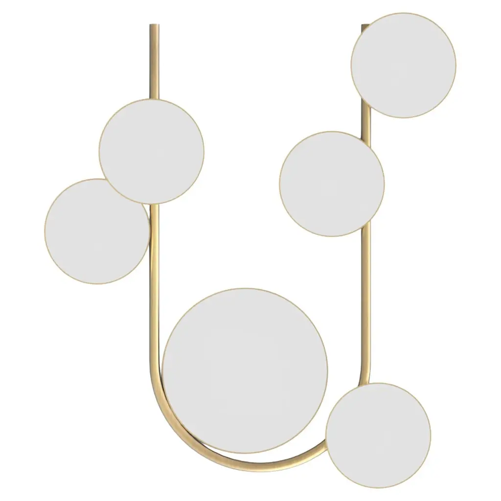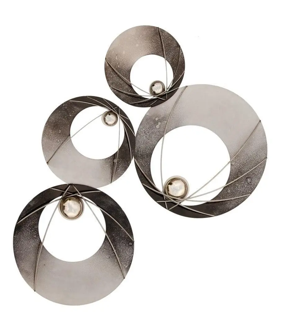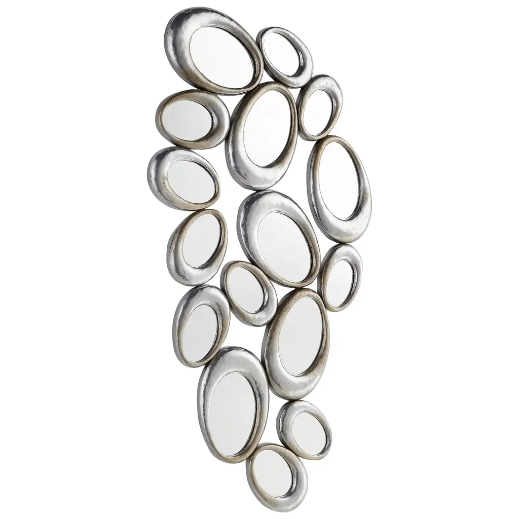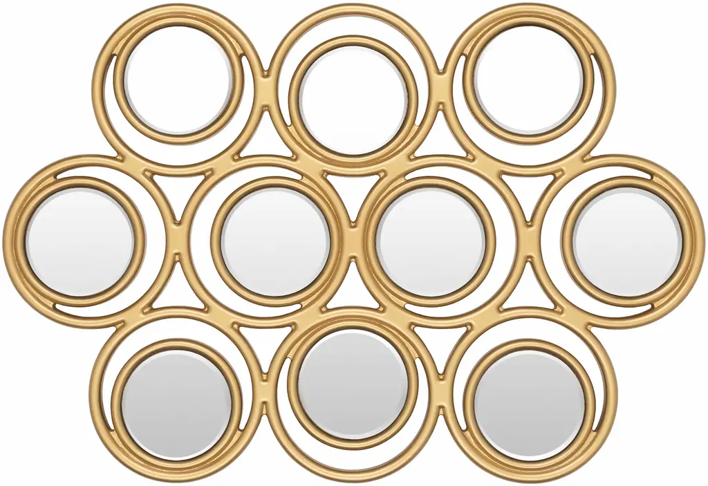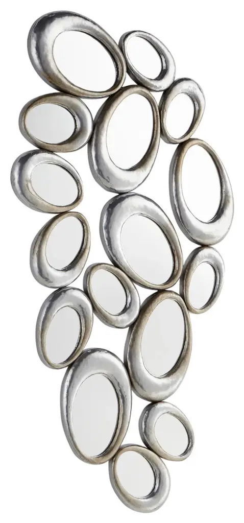 Mirror rings convex with metal frame inbronzage finish and with 8 convex mirrors.With 7 round black glass rounds.Also available with frame in gold leaf orsilver leaf finish.