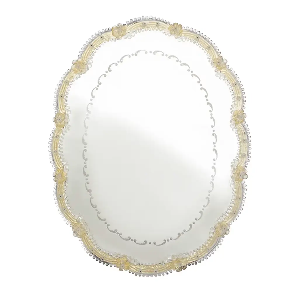 Classic oval Venetian mirror, made in the most rigorous Murano tradition. Finely hand-engraved on the elements of the bands, it is assembled with numerous floral elements in gold crystal handmade in the furnaces of Murano. Wooden frame with a natural finish.
