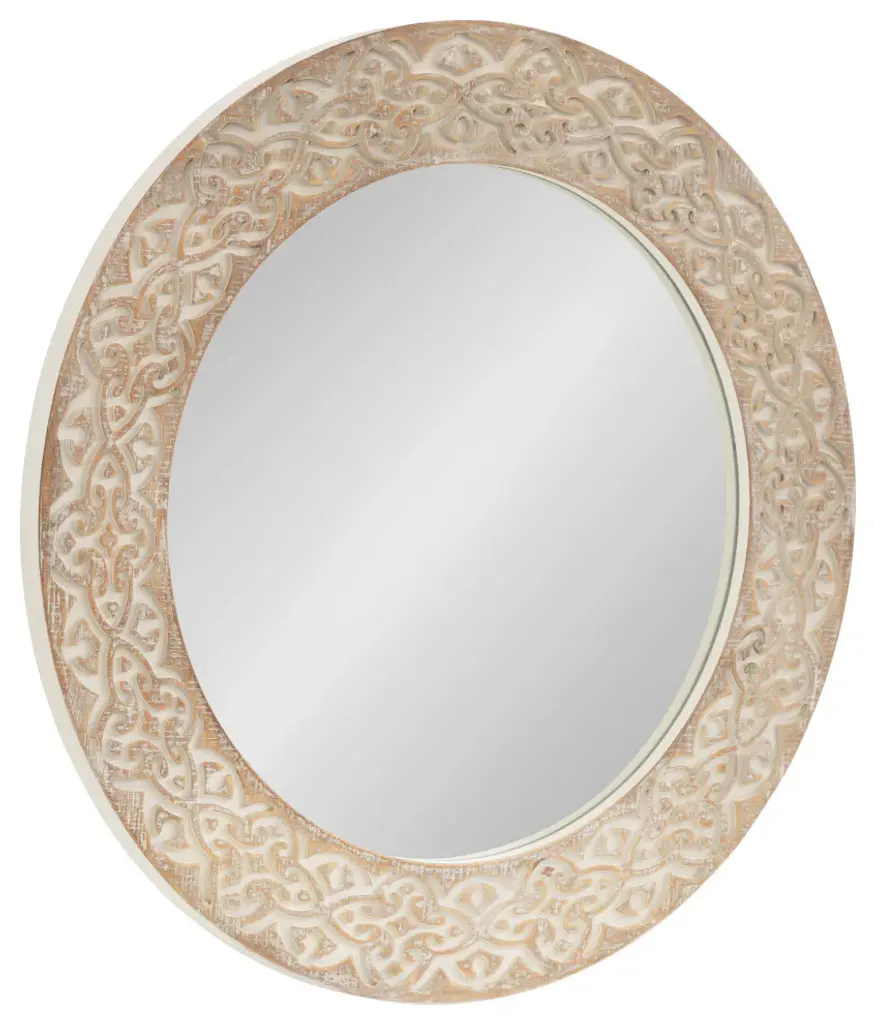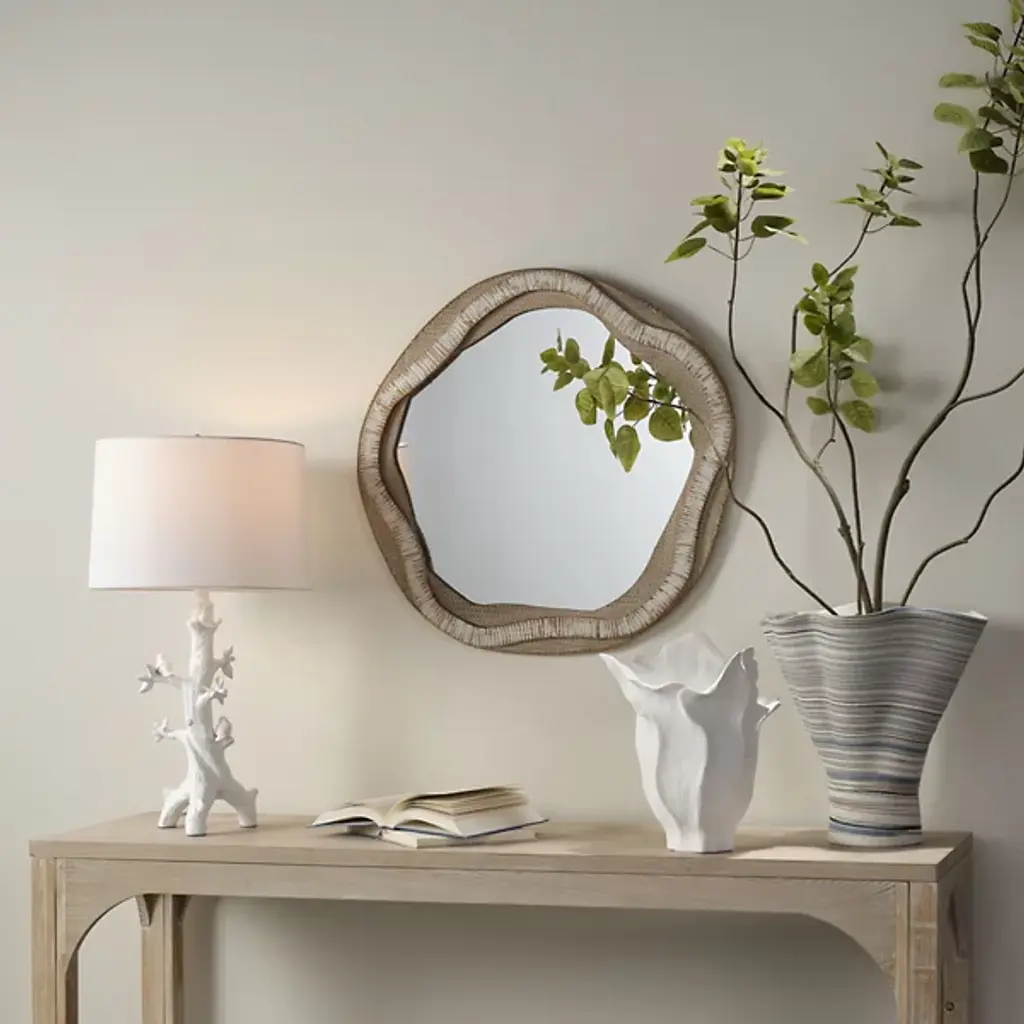 Present an arresting, rustic presence to interior walls with the River Organic Mirror from Jamie Young. A rounded mirror is enclosed by a flowing wood frame accented by rattan fibers that have been sustainably harvested, adding a curving, contoured edge to its surroundings that adds a sense of natural appeal to the edges of the mirror. Pale accent marks and fine patterns extend around the frame, adding a welcome sense of visual intrigue that draws the eye with ease. With its organic inspiration evident in both its shape and construction, this attractive wall mirror is handcrafted of wood, and the intriguing embellishments that edge its free-flowing shape are created from sustainably harvested rattan. The piece is finished in a soft palette of cream and beige that allows it to blend easily into most modern decors.