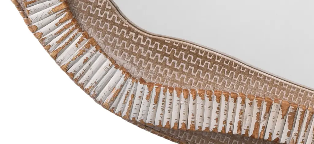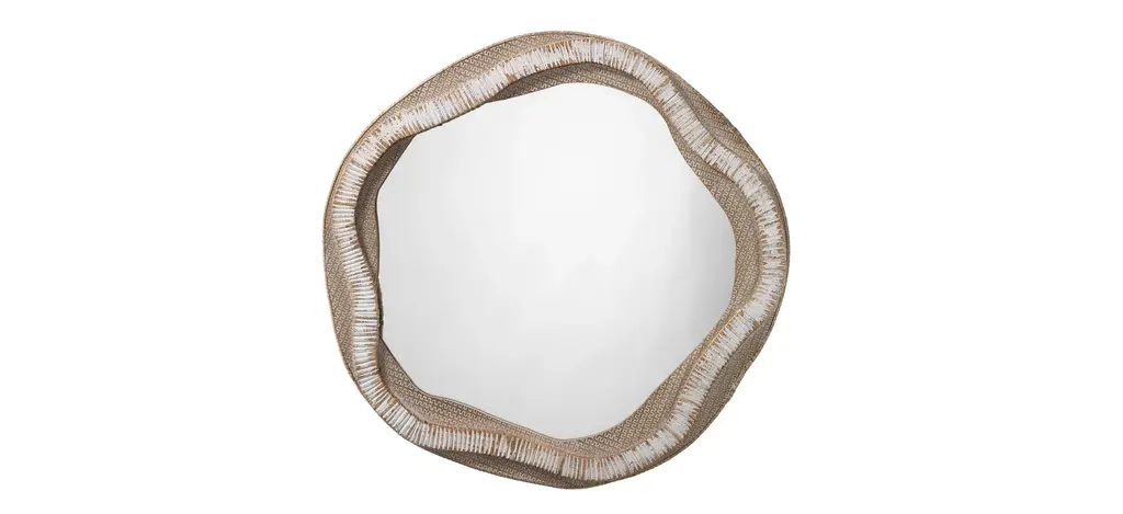The River Organic Mirror is an attractive wall mirror handcrafted of wood with embellishments created from sustainably harvested rattan. The soft palette of cream and beige allows it to blend easily into most modern decors.