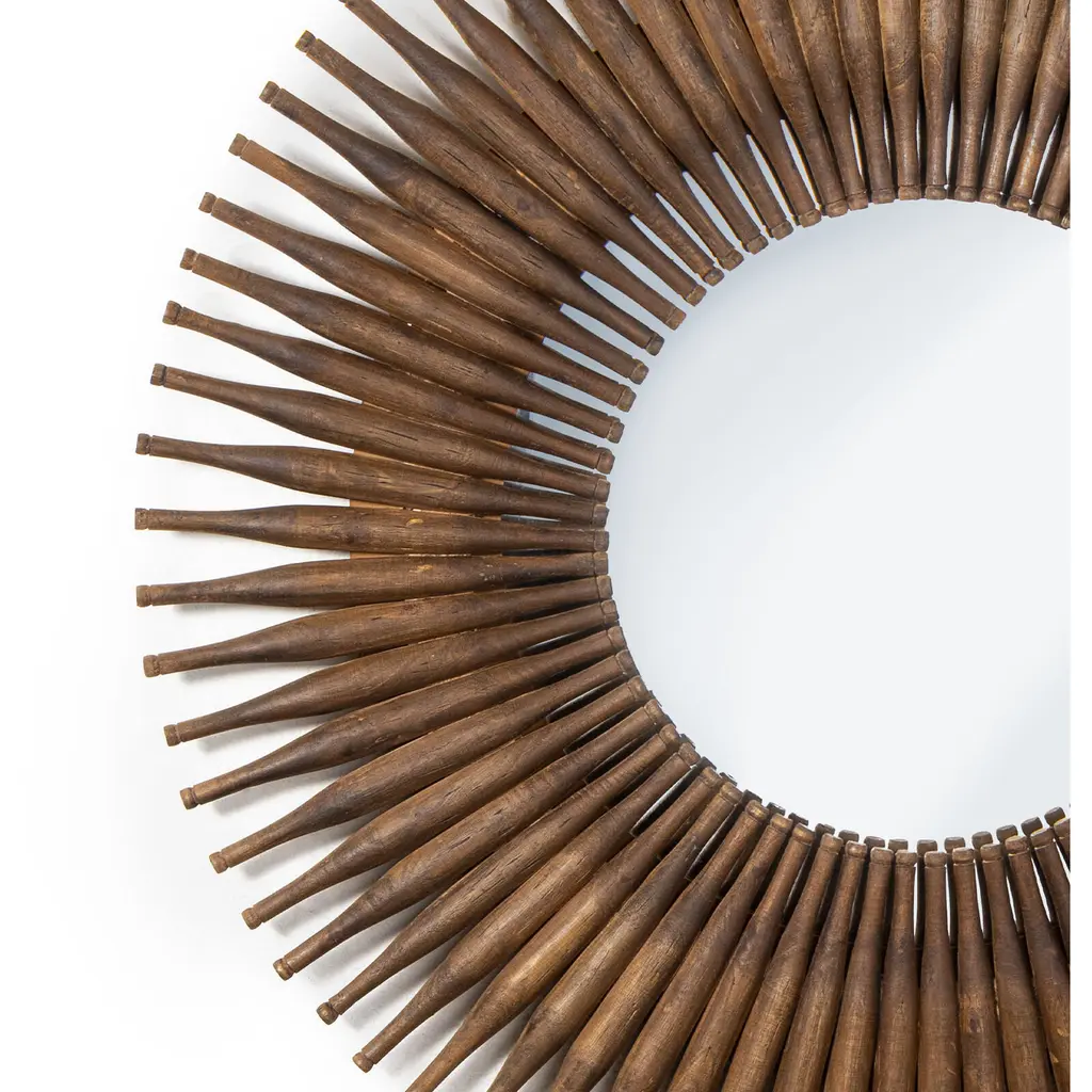 An eclectic blend of rustic and refined, this sculptural round mirror is handmade with antique inspired mini-rolling pins. Install this truly decorative mirror in a bathroom, bedroom, or entryway to create a unique focal point.