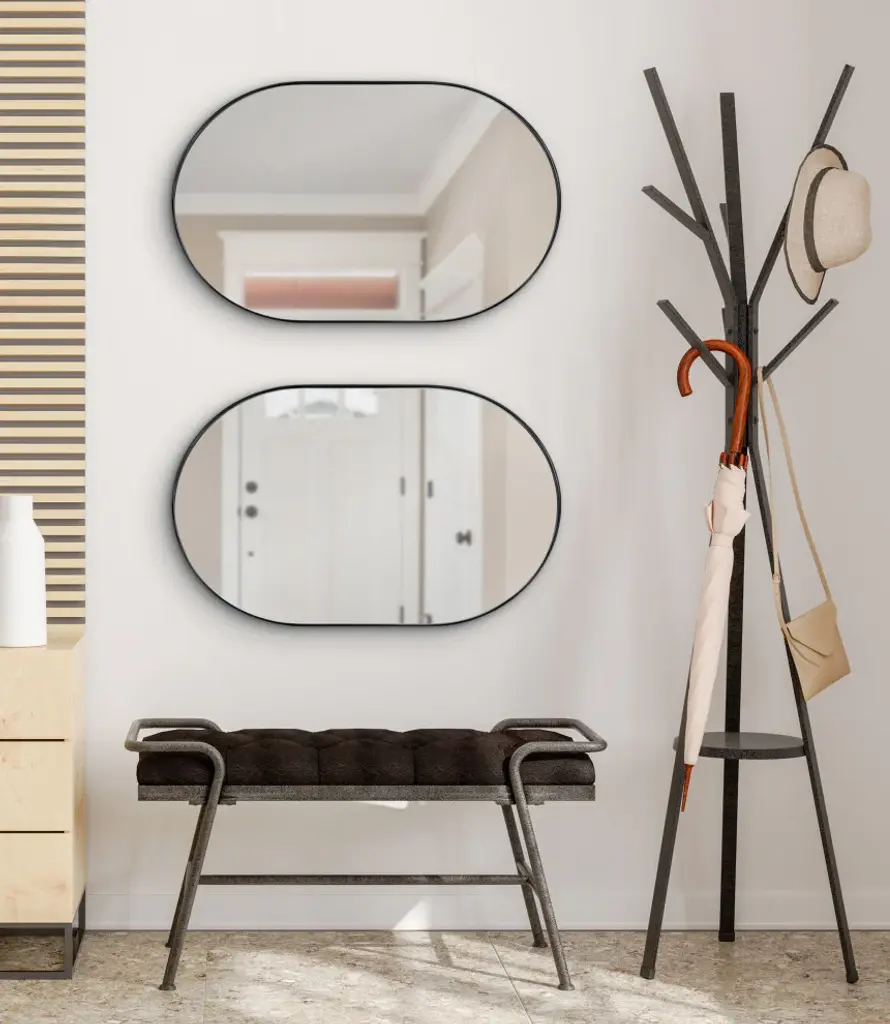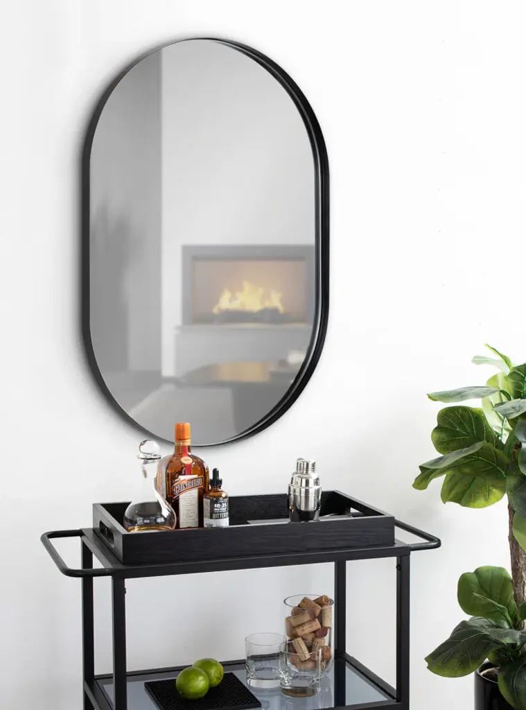 Enhance the modern sophistication of the walls of your home with this bold Rollo mirror. Inspired by contemporary aesthetics, this beautiful mirror features a geometric oval shape, presenting symmetrical arching lines to make a bold impression. The frame of the Rollo is made from a resilient metal material, giving it a robust look and quality. This frame also features a sleek black finish, making it a striking visual statement for any wall. The overall dimensions of this mirror are 20 inches by 1 inch by 30 inches. Its size makes the Rollo a fabulous focal point to create a cohesive room scene. Use it as a decorative accent in your living room, bedroom, or entryway, utilizing the large mirrored surface area to reflect light and enhance your space''s overall dimension and mood. If you''re looking to refresh your master bathroom or powder room, you can also use the Rollo capsule as a bathroom mirror above your vanity. This mirror hangs both vertically and horizontally for a transitional style that works in any space. Use the metal keyhole hangers attached to the back of the frame for quick and efficient installation in a matter of minutes.• BOLD DESIGN: Inspired by modern aesthetics, this mirror features a geometric capsule oval shape • QUALITY FRAME: This beautiful mirror has a slim metal frame with a black finish for a sleek and elegant look• LARGE SIZE: The overall dimensions of the Rollo capsule mirror are 20 inches by 30 inches, creating an eye-catching statement piece for any room of your home• VERSATILE: Use this lovely oval mirror as a functional bathroom mirror above your vanity or a decorative focal point to bring your aesthetic together in your entry, living room, or bedroom• EASY TO HANG: The Rollo mirror includes resilient keyhole hangers attached to the back of the frame for a quick and sturdy installation both vertically and horizontally