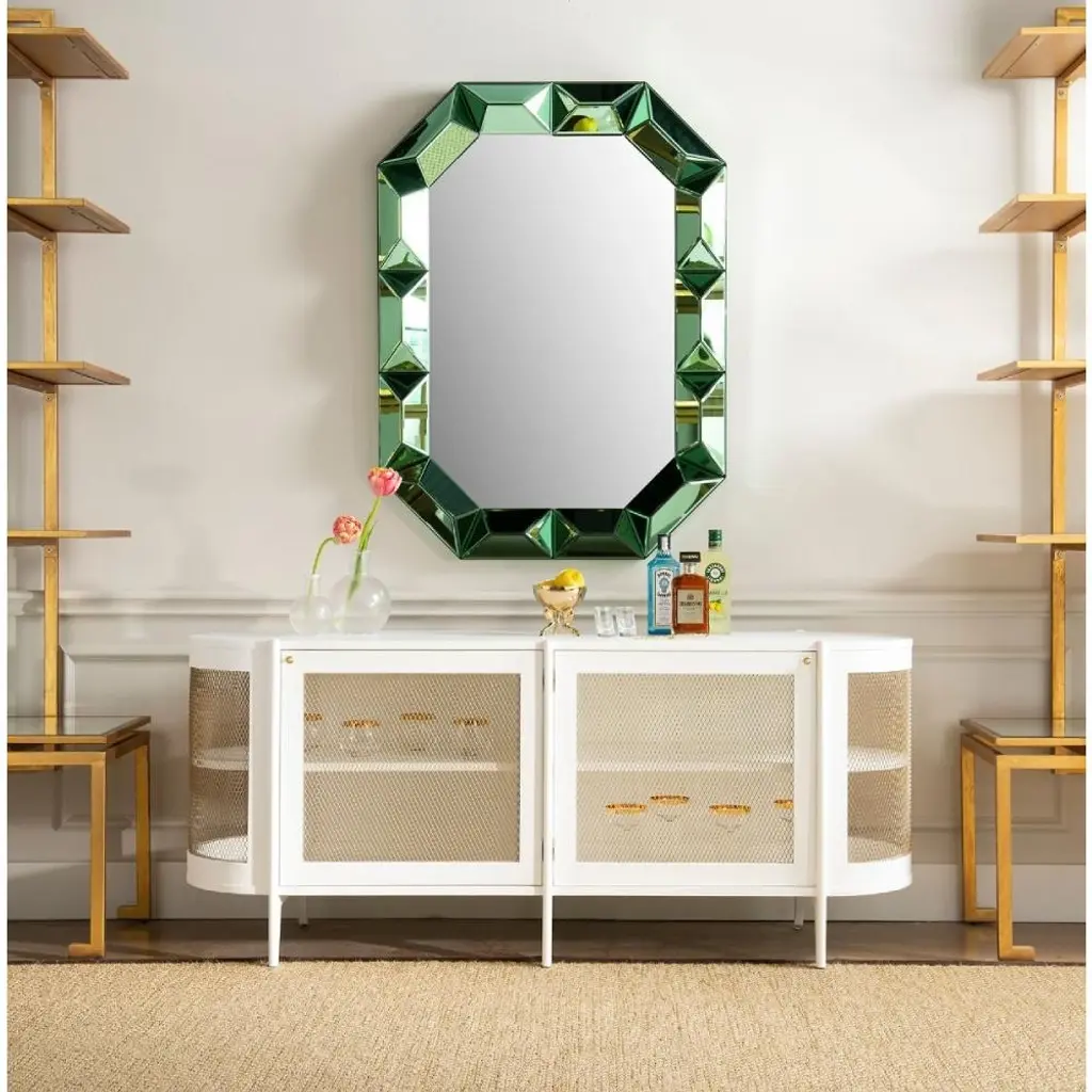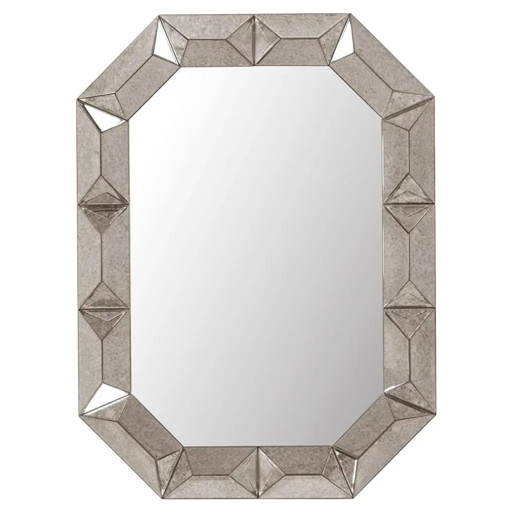 In our Romano Hollywood Regency Green Framed Wall Mirror, a long octagonal form complements the dynamic angularity and dimensions created by beveled patterns in the frame. The antique mirrored wood material adds a touch of aged elegance, making this piece a perfect accessory to both modern and classic styles.