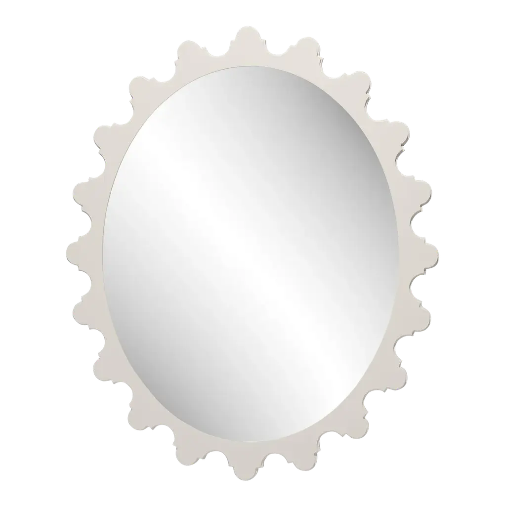 This exquisite mirror, with its grand scale and delicate scalloped edge, is a testament to timeless elegance and charm. Its beautifully shaped wooden frame exudes a whimsical flair that effortlessly enhances any space. The mirror's surface, adorned with a subtle bevel, captures light in a way that adds depth and dimension. Its antiqued finish whispers of romance and nostalgia, making it a captivating focal point in any room. Let this mirror be a reflection of your style, adding a touch of sophistication and grace to your home.