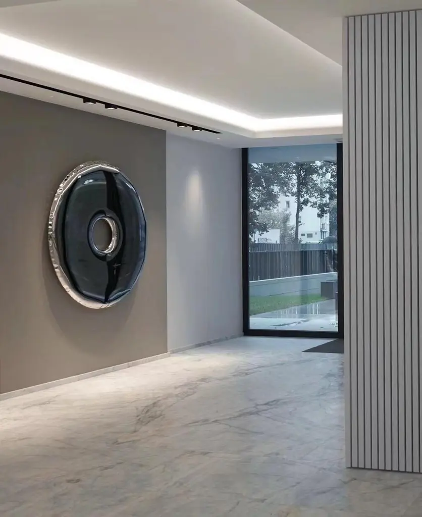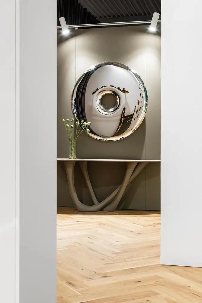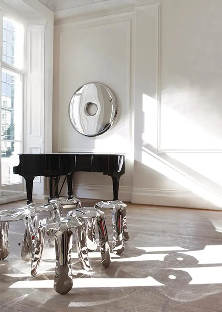 The rondo mirror is made of stainless steel polished to high gloss. Its polished surface is perfectly reflecting the light and other objects placed in the same room or hall. Largescale convexities that appear on the surface of the mirror are literally able to alter the space. It is like making an individualized interior design of the moment when by rolling the mirror from one place to another everybody can create or rediscover a well-known environment to a brand new and grasping concept.Available in emerald color, sapphire color, gradient of emerald and sapphire color, dark matter color, and deep space blue color.About the artist/ designer:Oskar Zieta - an architect, designer, artist and innovator. Born in 1975, after he graduated architecture at Szczecin University of Technology in 2000, he has got a scholarship at ETH Zurich. Over the course of 2 years of postgraduate studies he developed skills in parametric design and modern manufacturing technologies finalized with PhD graduation. Currently he runs the department of Industrial Design at School of Form. Laureate of many prestigious awards in design and technology. Inventor of FiDU - inner pressure metal forming technology - the keystone to Zieta Collection, Zieta Out of Ordinary as well as large scale sculptures like NAWA on Daliowa Island in Wroclaw and WIR in Galeria Pólnocna in Wroclaw.Ambassador of Warsaw Home & Contract Fair. Oskar Zieta has been awarded the AUDI - Mentor-Price 2011, the Red Dot Award 2008, DMY Award for Innovation in production process 2008, the YDMI 2008, the German Design Council Prize 2009, the Forum Aid Awards 2009, Technology Award Materialica 2009, MUST HAVE Design Lódz 2011 and was nominated to Mies Van Der Rohe Award 2019, the Schweizer Design Preis 2009 and the Dobry Wzór, 2009. His designs carved out their way into numerous prestigious collections including Centre Pompidou in Paris, the Pinakothek der Moderne in Munich, Zurich Design Museum and the Baden State Museum In Karlsruhe.Oskar Zieta is a CEO of Zieta Studio established in 2010 in Wroclaw. The company is an interdisciplinary team of architects, designers, engineers and technologists as well as production line and Industrial implementation workers. Specialists in many fields are permanent collaborators of Zieta Studio - psychologists, biologists, scientists and many others. FiDU Innovation Lab develops its own, innovative technologies of stabilizing sheet metal, i.e. FiDU and 3+ and their application to modern architecture, engineering and design.
