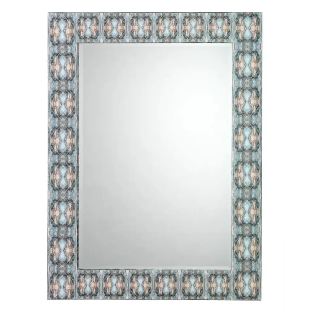 Inspired by Rorschach inkblots tests, known to examine emotion through interpretation, our Rorschach mirror inspires you to look closer into the neutral tones of grey, taupe and cream, accented with silver and gold leaf. These components create dynamic patterns through overlaid photos underneath a clear lacquer.