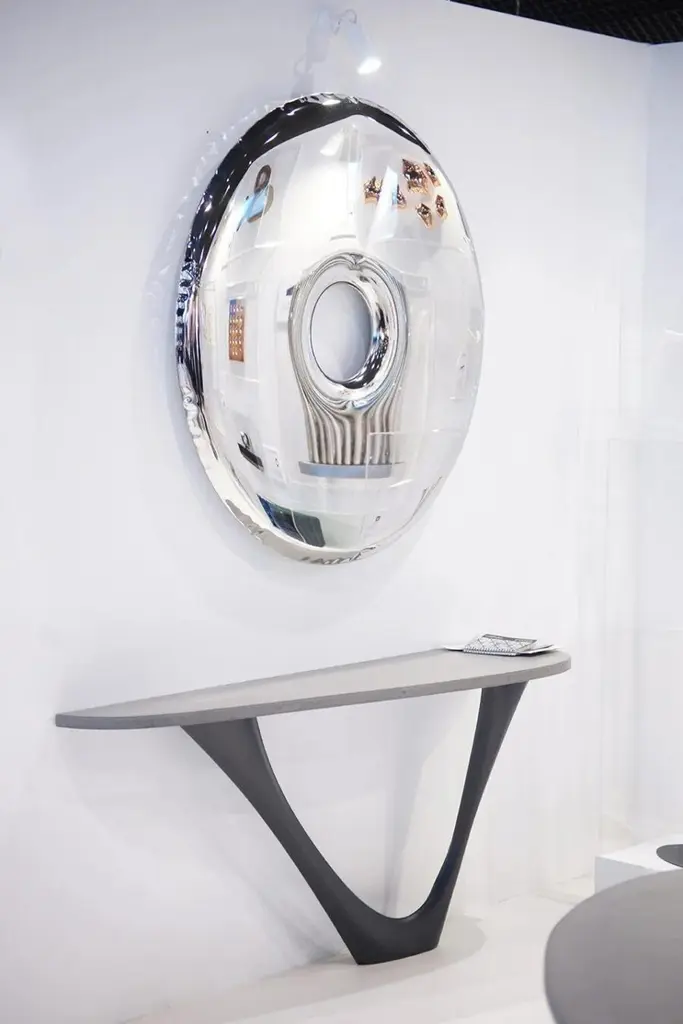 Rose gold Rondo 150 wall mirror by ZietaDimensions: Diameter 150 x Depth 6 cm Material: Stainless steel.Finish: Rose gold. Available finishes: white matt, sapphire/emerald, sapphire, emerald, deep space blue, dark matter, red rubin, light gold, classic gold, or rose gold. Also available in sizes ø75, ø120, and ø95cm.The Rondo mirror is made of stainless steel polished to a high gloss. Its polished surface is perfectly reflecting the light and other objects placed in the same room or hall. Largescale convexities that appear on the surface of the mirror are literally able to alter the space. It is like making an individualized interior design of the moment when by rolling the mirror from one place to another everybody can create or rediscover a well-known environment to a brand new and grasping concept. Depending on Rondo´s arrangement, either by hanging it or leaning at the wall, the mirror can change the perception of the surroundings.Deep, dark, blue, and intriguing. The new unique finish of Rondo Deep Space Blue takes the spectators for an unexpected journey into an undiscovered world of reflections. The mirror resembles cosmic wonders and at the same time can be fitted with the most demanding and elegant interiors. Color gives meaning and brings associations. The Gradient collection presents the whole spectrum of shades of cool sea depth. Carefully selected colors blend well with the hard steel.About Zieta: Zietas main goal is to deliver uniqueness and customization in design and construction while keeping the production, transport, and warehousing innovatively efficient.This is how they imagine the future world: Light, durable structures of customized applications produced on demand out of one-of-a-kind parts, yet efficiently.They use a computer-controlled production process. Customized pattern, customized form, customized function, one-of-a-kind product, and outstanding precision are what they deliver.You will find all of this philosophy reflected in the products. They research, they discover new possibilities, they play with forms and they deliver a beautiful, innovative, surprising outcome to people who love the design and who care about design development.They believe their work is a valuable contribution to the world of design not only by the unique beauty of the forms but most of all by opening ultra-innovative opportunities of forming and new paths for the world of the future.