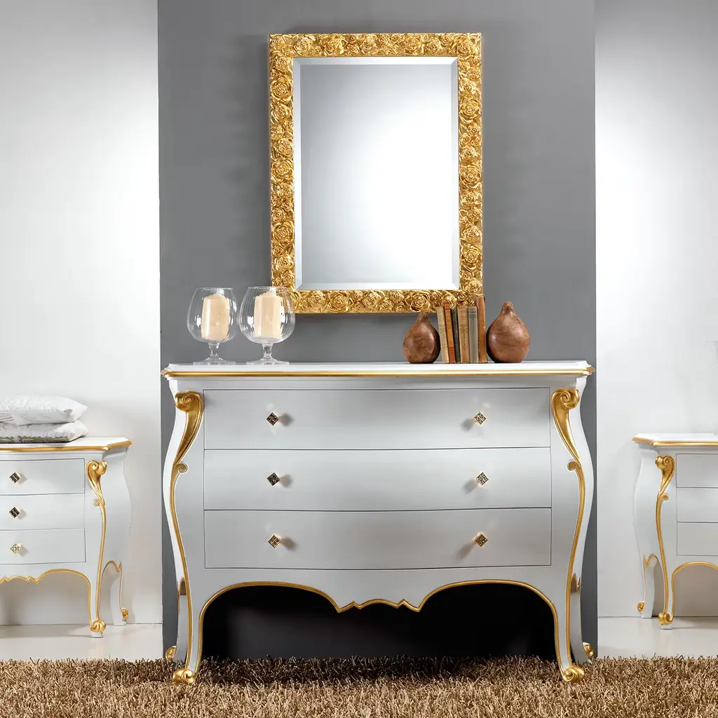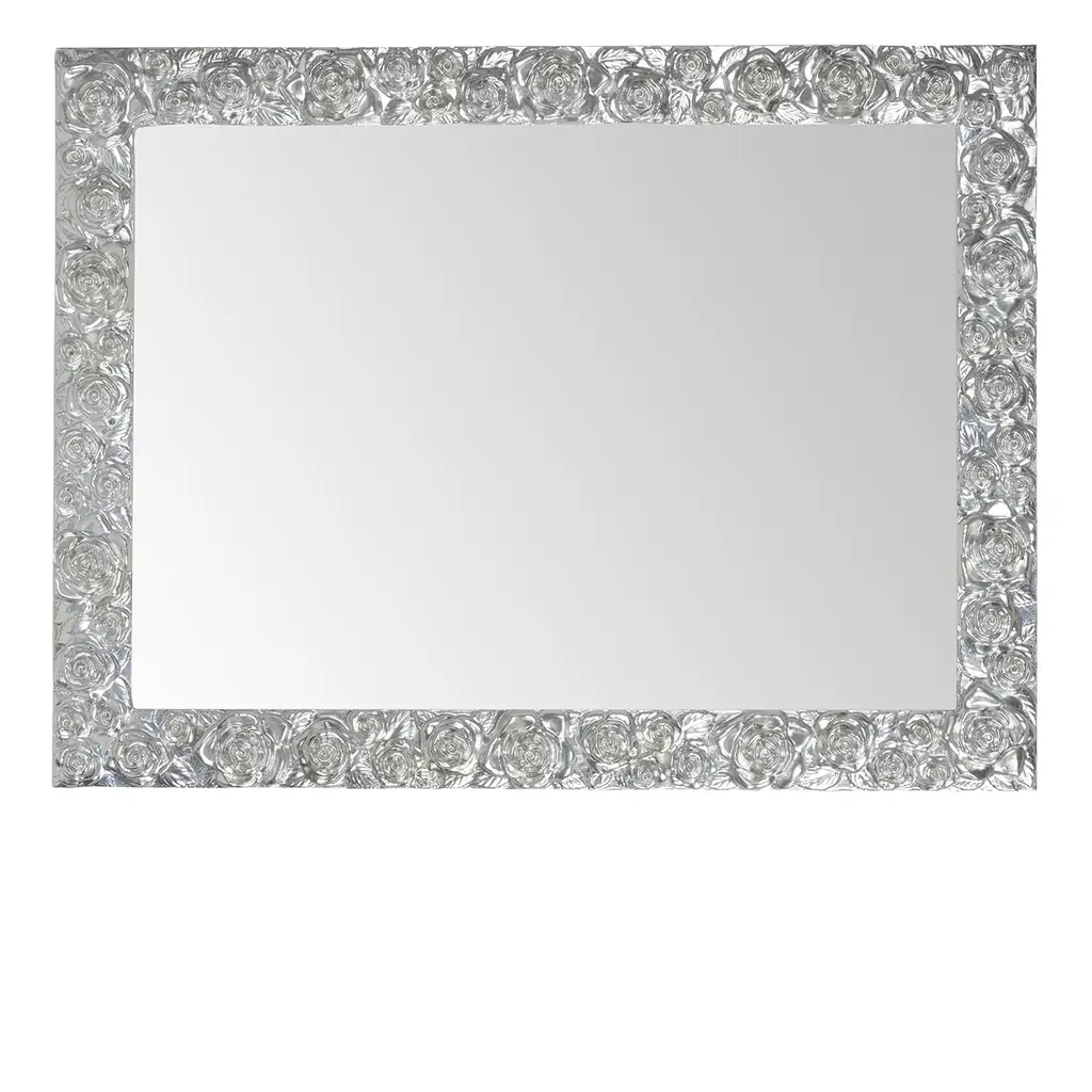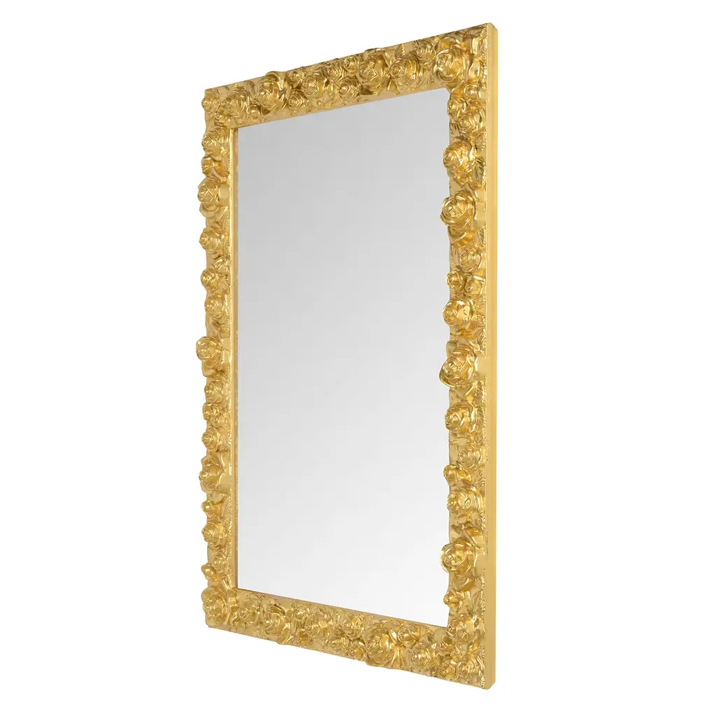 Poetic flair distinguishes this rectangular wall mirror of classic inspiration. The mirrored crystal panel (4mm-thick, 50x70cm) is wrapped by a wooden frame whose minutely inlaid pattern of blooming roses and leaves is fully covered in a thin mantle of gold leaf. Also available in silver leaf versions, it can be freely hung both vertically or horizontally to taste.