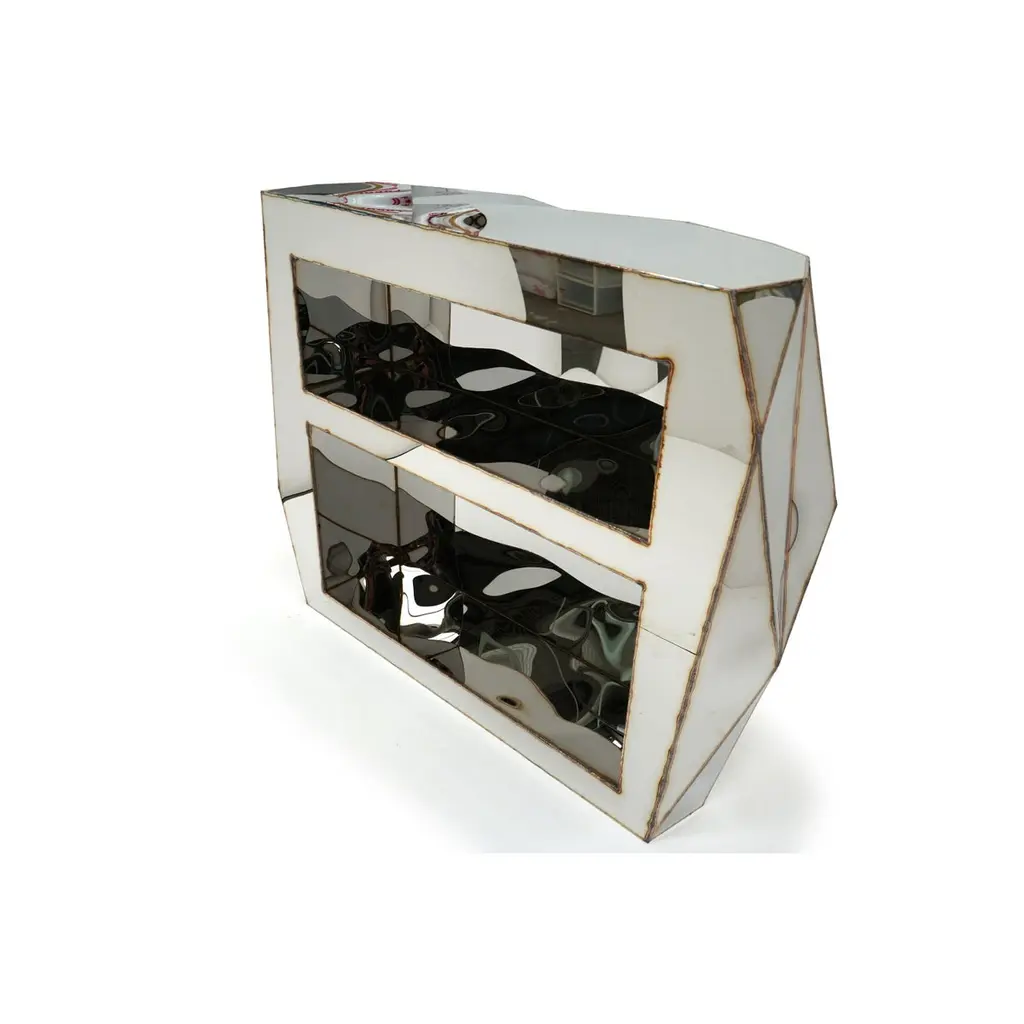 Rough Split Bar in Welded Mirror-Polished Stainless Steel by Julian MayorLimited Edition of 10 Pieces.Dimensions: D 50 x W 135 x H 107 cm. Materials: Mirror-polished stainless steel.Julian Mayor is a British artist and designer renowned for his sculptural works crafted from welded sheet metal. Using high-tech design processes, the artist creates each piece digitally on a computer before building it by hand in his workshop. Born in 1976, Mayor graduated with a BA in Industrial Design from the University of Northumbria in 1998, followed by an MA from the Royal College of Art in Design Products under Ron Arad. After graduating in 2000, he moved to Northern California and worked for a design consultant agency as a product and interior designer. By 2004, Mayor returned to London to work for UK-based agencies, including Pentagram, and collaborated with British designer Tom Dixon. The artist’s work has been exhibited at the Victoria & Albert Museum, London, the Museum of Arts and Design, New York, MUDAC Lausanne, Switzerland, and the Yorkshire Sculpture Park, UK. He has installed a permanent series of sculptural benches in a park behind the Tate Britain in Pimlico, London. Mayor lives and works in Doncaster, South Yorkshire, UK.