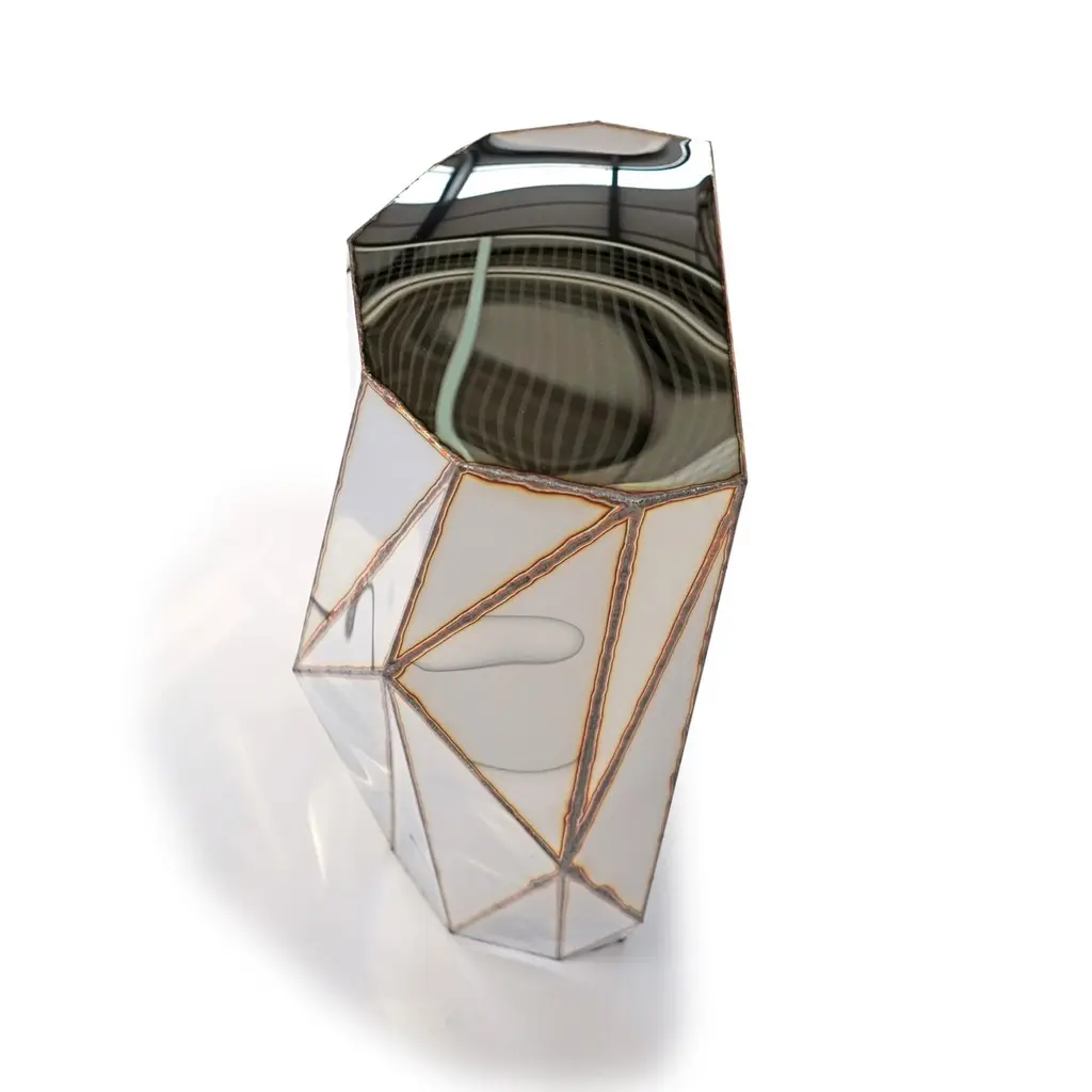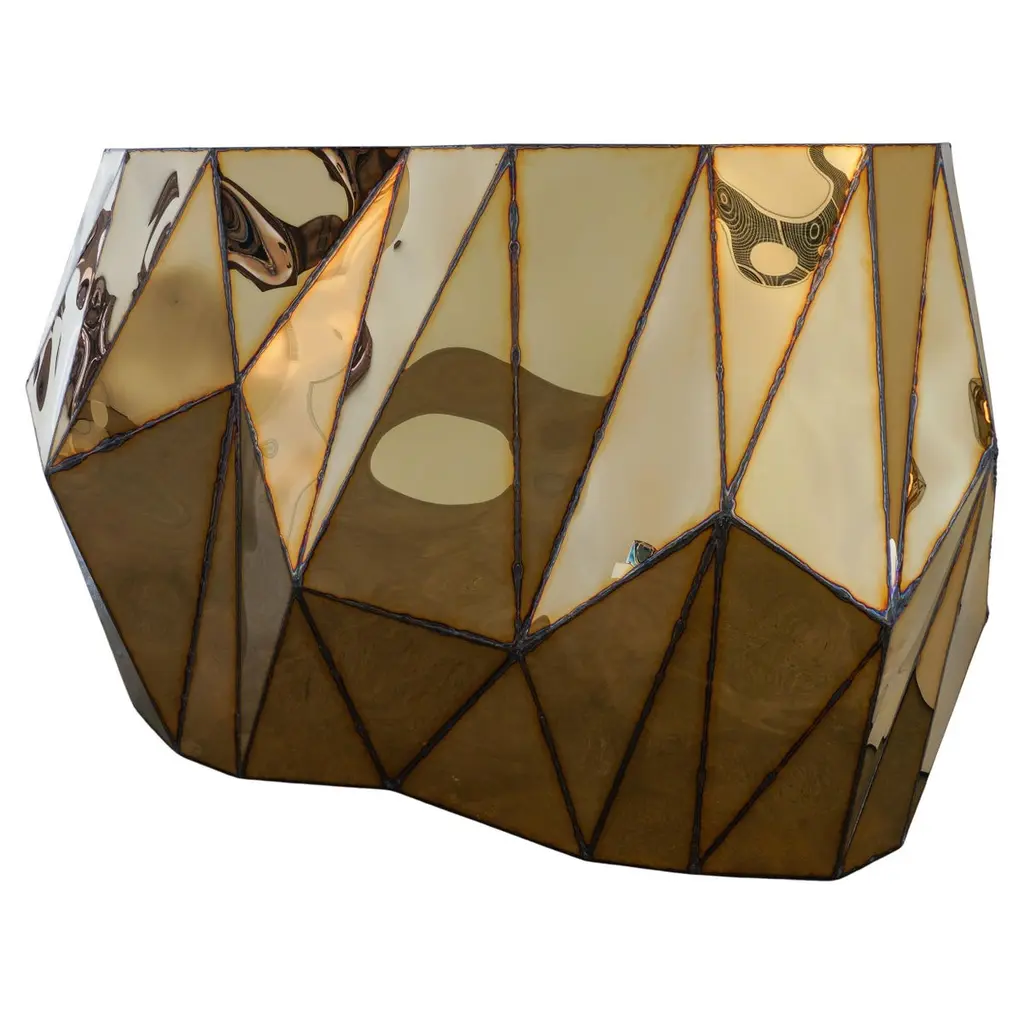 Rough Split Console in Welded Mirror-Polished Stainless Steel by Julian MayorLimited Edition of 8 + 4AP.Dimensions: D 46 x W 84 x H 89 cm. Materials: Mirror-polished stainless steel.Julian Mayor is a British artist and designer renowned for his sculptural works crafted from welded sheet metal. Using high-tech design processes, the artist creates each piece digitally on a computer before building it by hand in his workshop. Born in 1976, Mayor graduated with a BA in Industrial Design from the University of Northumbria in 1998, followed by an MA from the Royal College of Art in Design Products under Ron Arad. After graduating in 2000, he moved to Northern California and worked for a design consultant agency as a product and interior designer. By 2004, Mayor returned to London to work for UK-based agencies, including Pentagram, and collaborated with British designer Tom Dixon. The artist’s work has been exhibited at the Victoria & Albert Museum, London, the Museum of Arts and Design, New York, MUDAC Lausanne, Switzerland, and the Yorkshire Sculpture Park, UK. He has installed a permanent series of sculptural benches in a park behind the Tate Britain in Pimlico, London. Mayor lives and works in Doncaster, South Yorkshire, UK.