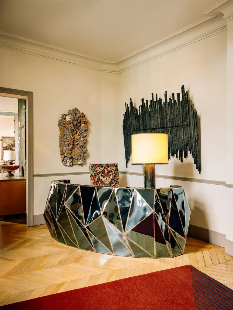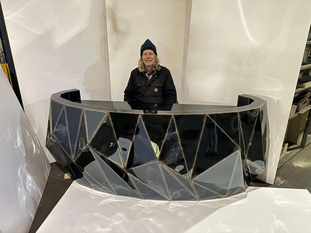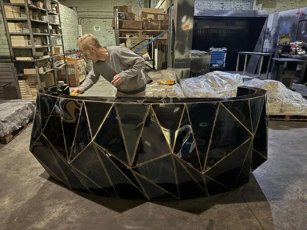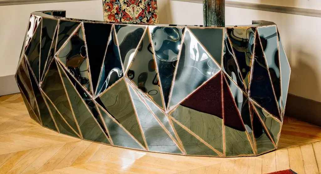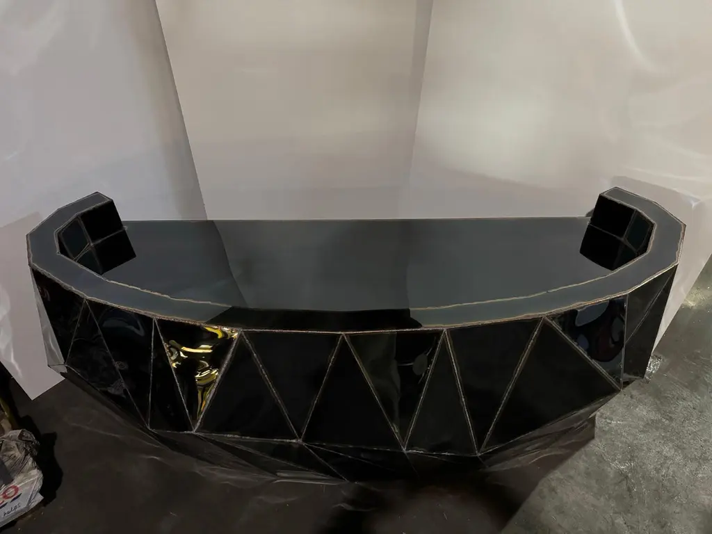 Rough Split Reception Desk in Mirror-Polished Stainless Steel by Julian MayorLimited Edition of 3 Pieces.Dimensions: D 82 x W 237 x H 90 cm. Materials: Mirror-polished stainless steel.Julian Mayor is a British artist and designer renowned for his sculptural works crafted from welded sheet metal. Using high-tech design processes, the artist creates each piece digitally on a computer before building it by hand in his workshop. Born in 1976, Mayor graduated with a BA in Industrial Design from the University of Northumbria in 1998, followed by an MA from the Royal College of Art in Design Products under Ron Arad. After graduating in 2000, he moved to Northern California and worked for a design consultant agency as a product and interior designer. By 2004, Mayor returned to London to work for UK-based agencies, including Pentagram, and collaborated with British designer Tom Dixon. The artist’s work has been exhibited at the Victoria & Albert Museum, London, the Museum of Arts and Design, New York, MUDAC Lausanne, Switzerland, and the Yorkshire Sculpture Park, UK. He has installed a permanent series of sculptural benches in a park behind the Tate Britain in Pimlico, London. Mayor lives and works in Doncaster, South Yorkshire, UK.