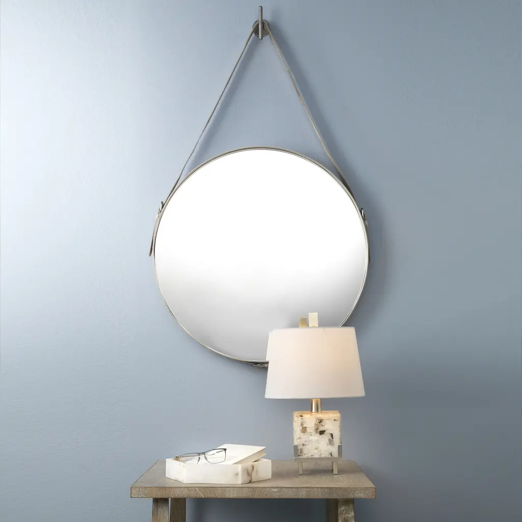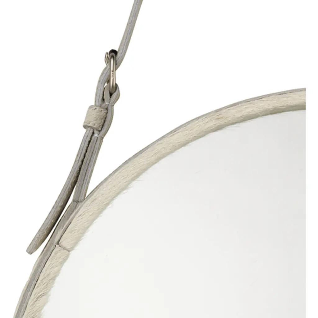 This gorgeous wall mirror brings the allure of rugged white leather cowhide into your home as the frame and hanging strap of this fantastic wall mirror. The non-adjustable strap hangs from an included brass knob, a wonderful finishing detail.