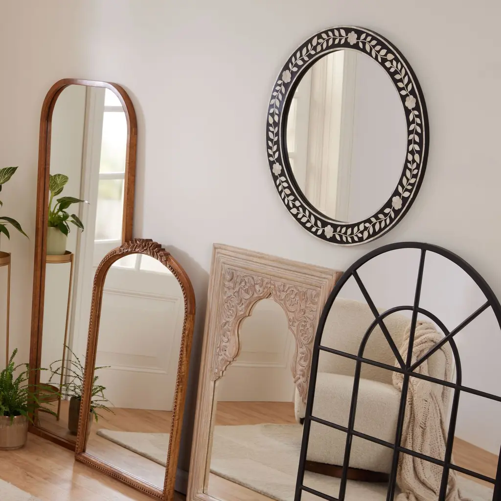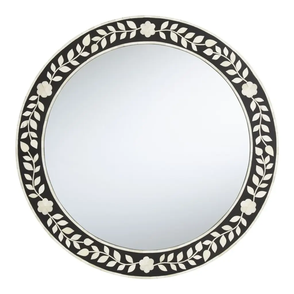 In a sophisticated round shape, our exclusive wall mirror is decorated with a white floral inlay on a black backdrop. Handcrafted by skilled artisans of sustainably sourced bone, this circle mirror lends chic botanical-inspired beauty to any room in your home.