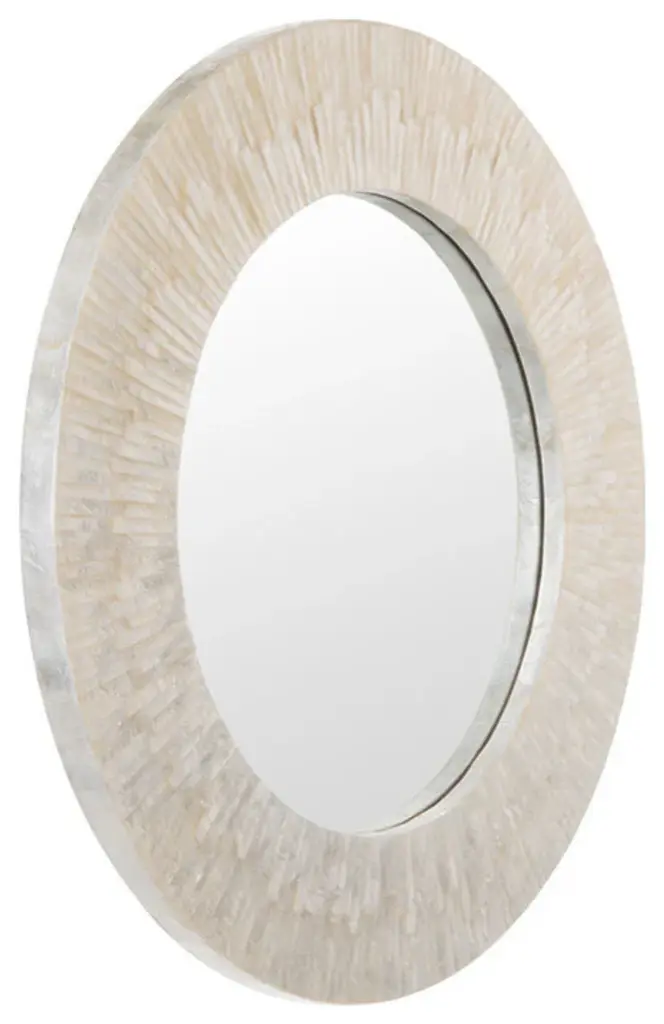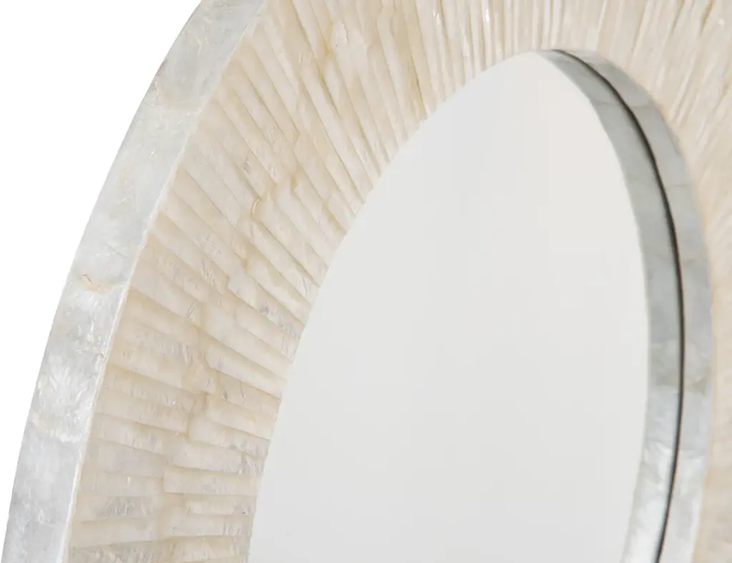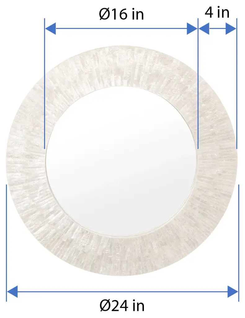 Diameter 24 inches x 2 inches deep. Diameter mirrored glass only 16 inches.Capiz Seashell hand set on wood frame.Mirrored glass can be cleaned with any glass cleaner. Use dry cloth to clean frame.The luster of the white Capiz seashell arranged in an intriguing pattern creates the illusion of sun rays. Placed on any wall in your home whether entrance, living room or bedroom this decorative wall mirror exudes sophistication and adds a tropical or coastal touch.