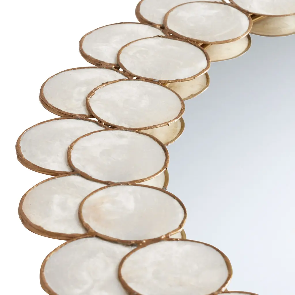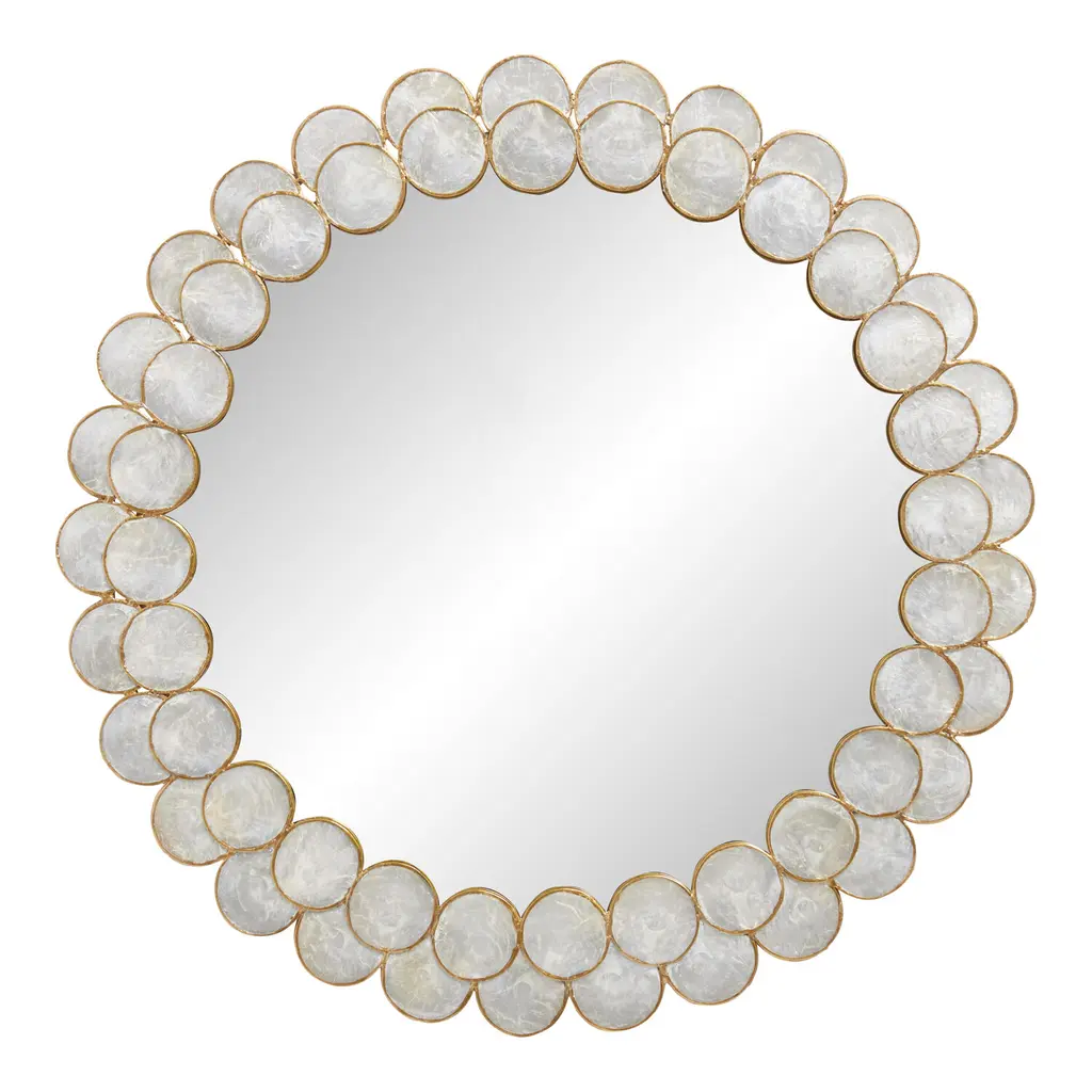 Gold-rimmed discs of iridescent capiz shell surround our round wall mirror in a radiant, layered frame. Bright with natural beauty, the capiz features a natural light-champagne tint that brings a warm brilliance to your wall decor. Ready to hang in bedrooms, bathrooms and foyers, this mirror brings lustrous charm wherever it's placed in your home.