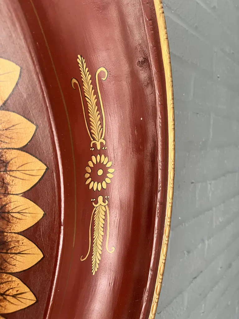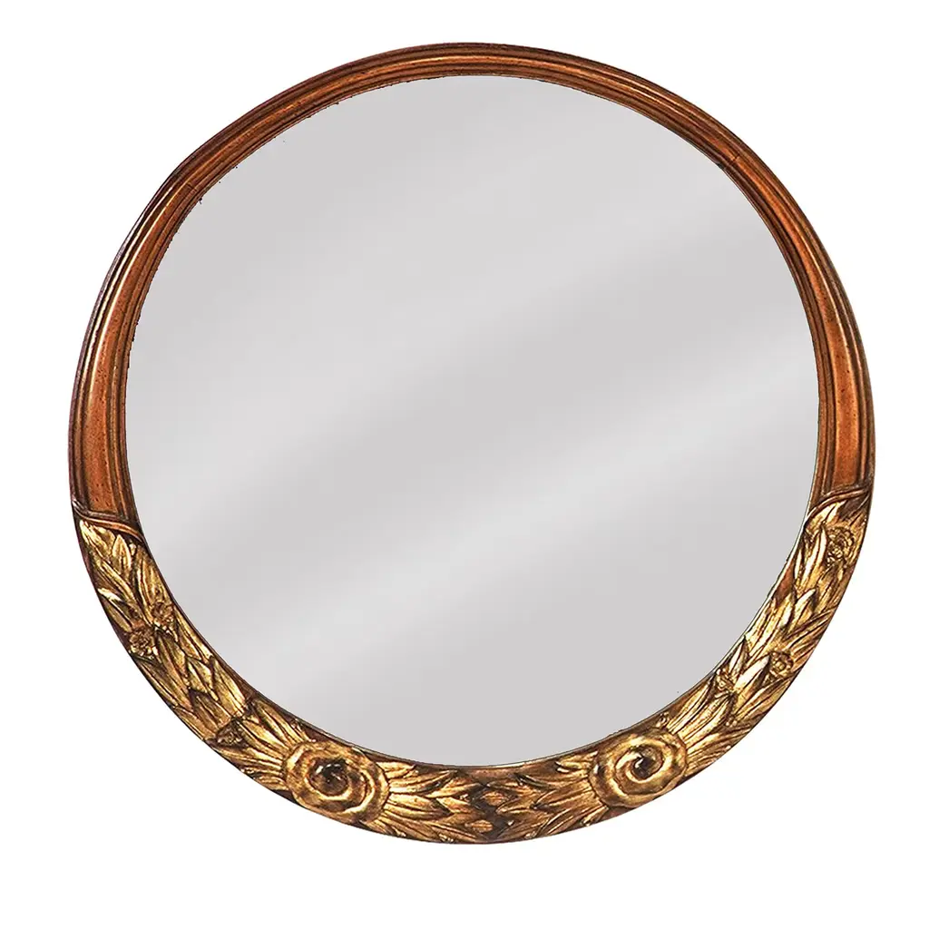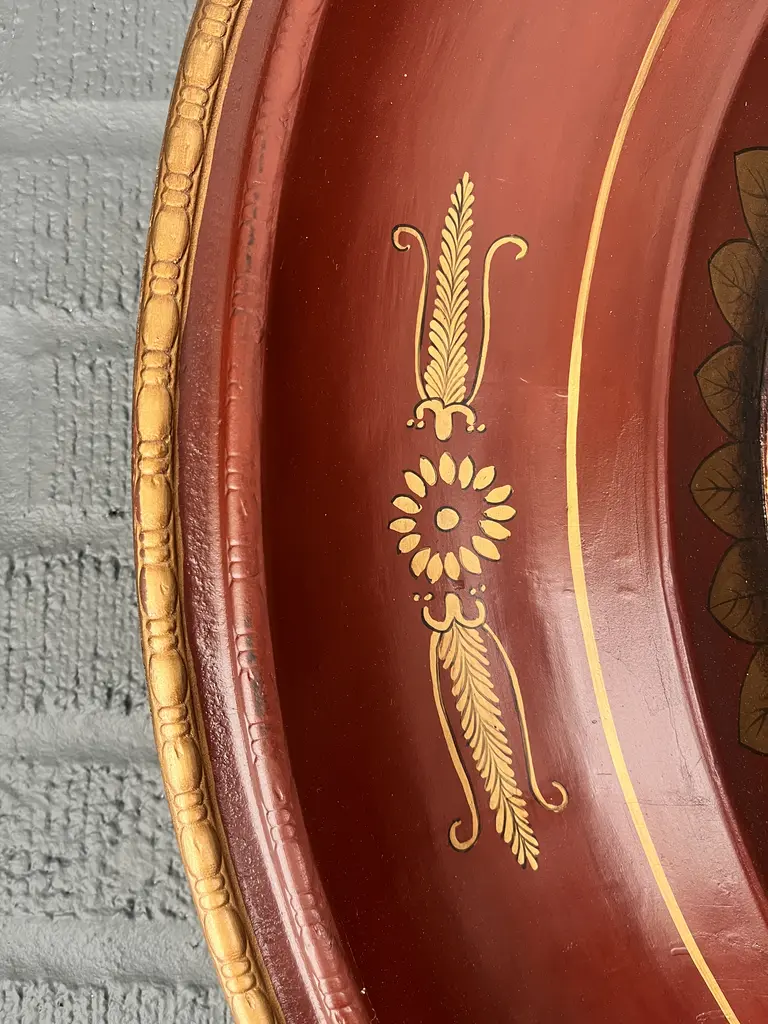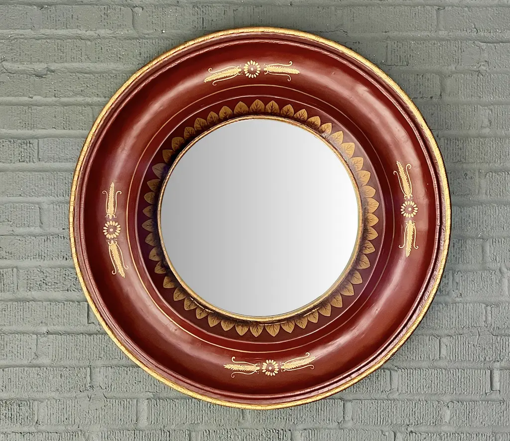 Round red painted wall mirror with hand-painted gilded detailing. Beveled reflective glass. Comes ready to hang. Excellent vintage condition. Glass interior measures 17"D.