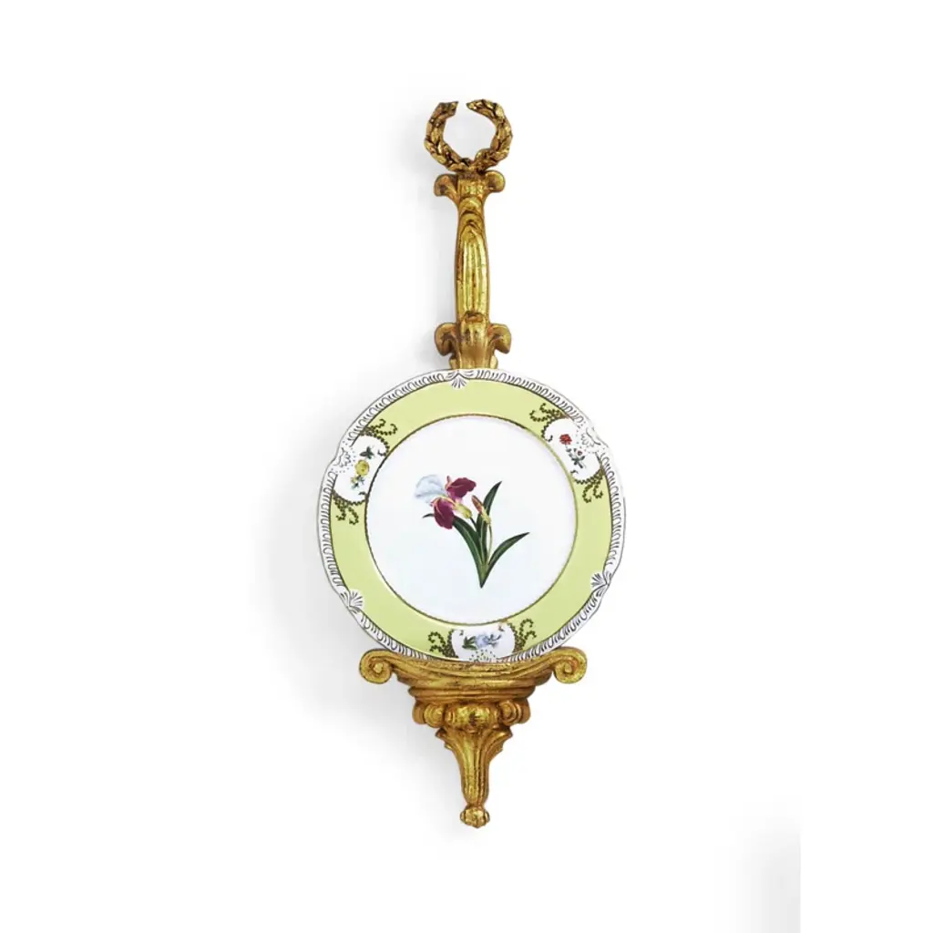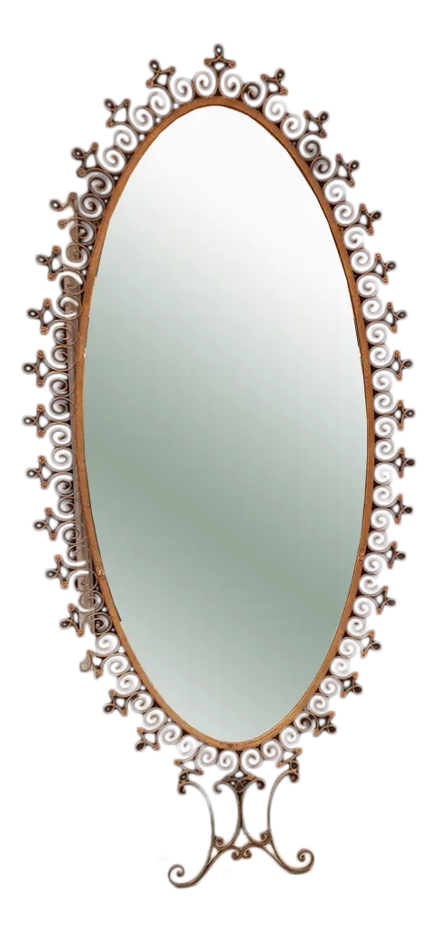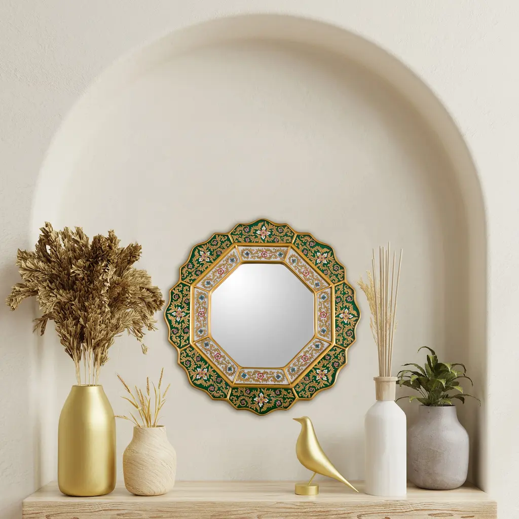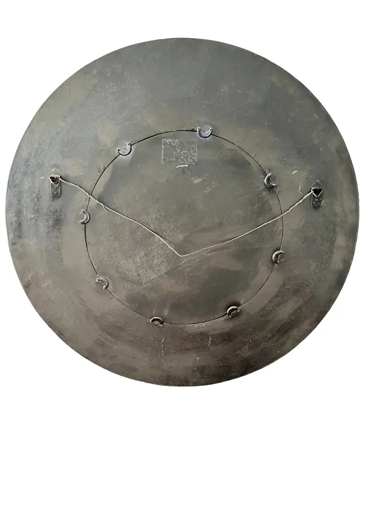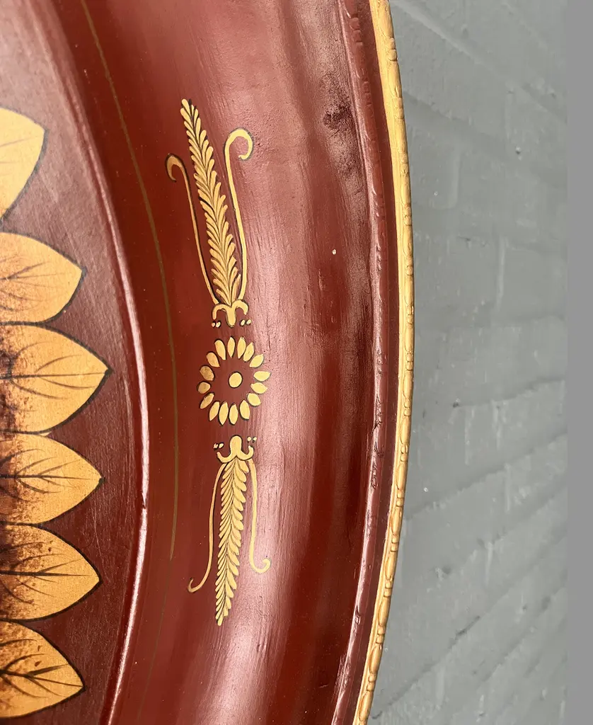 Round red painted wall mirror with hand-painted gilded detailing. Beveled reflective glass. Comes ready to hang. Excellent vintage condition. Glass interior measures 17"D.