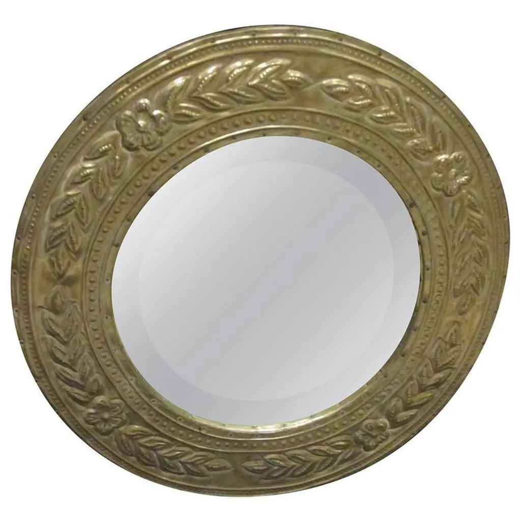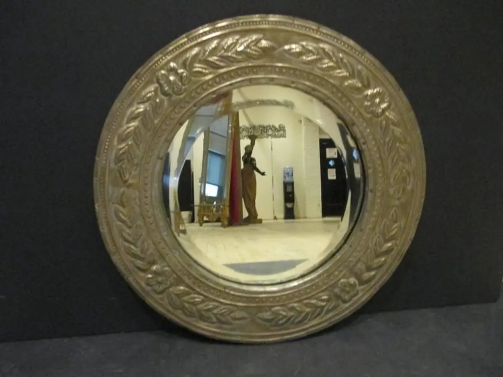 Round metal-clad mirror.Tin metal antique finish.Overall size H 19"(48cm) diameter.Center mirror panel clear mirror with beveled mirror.