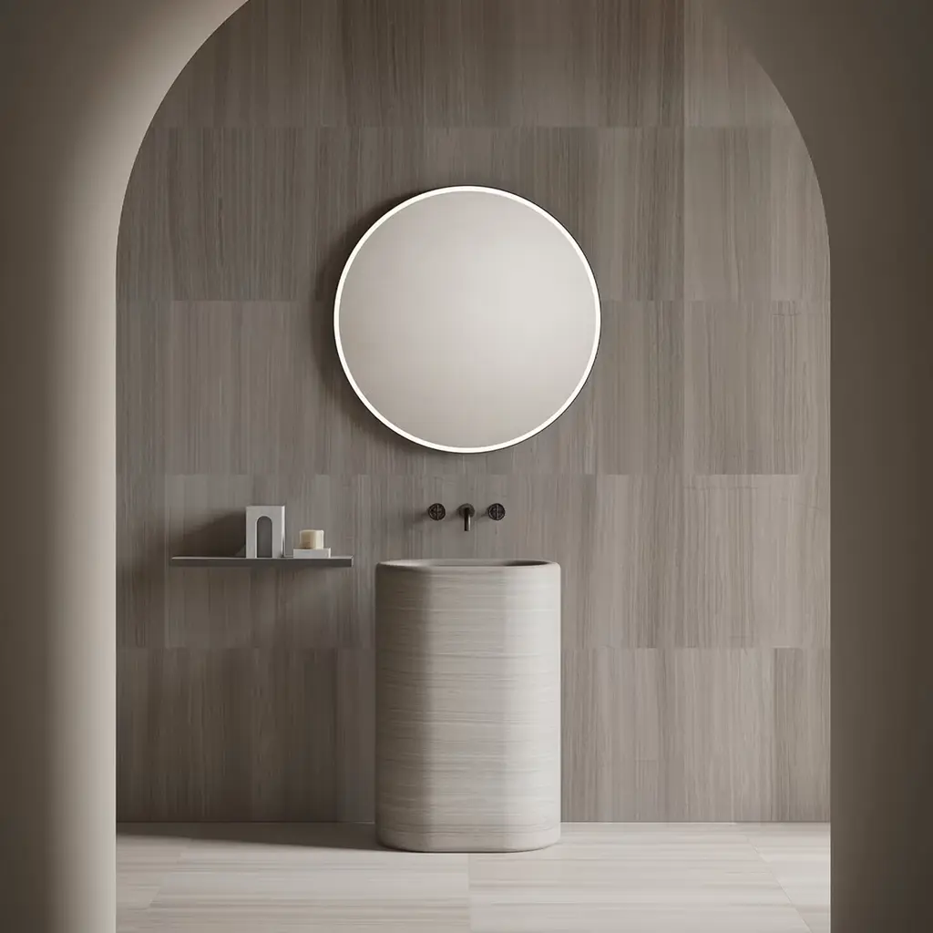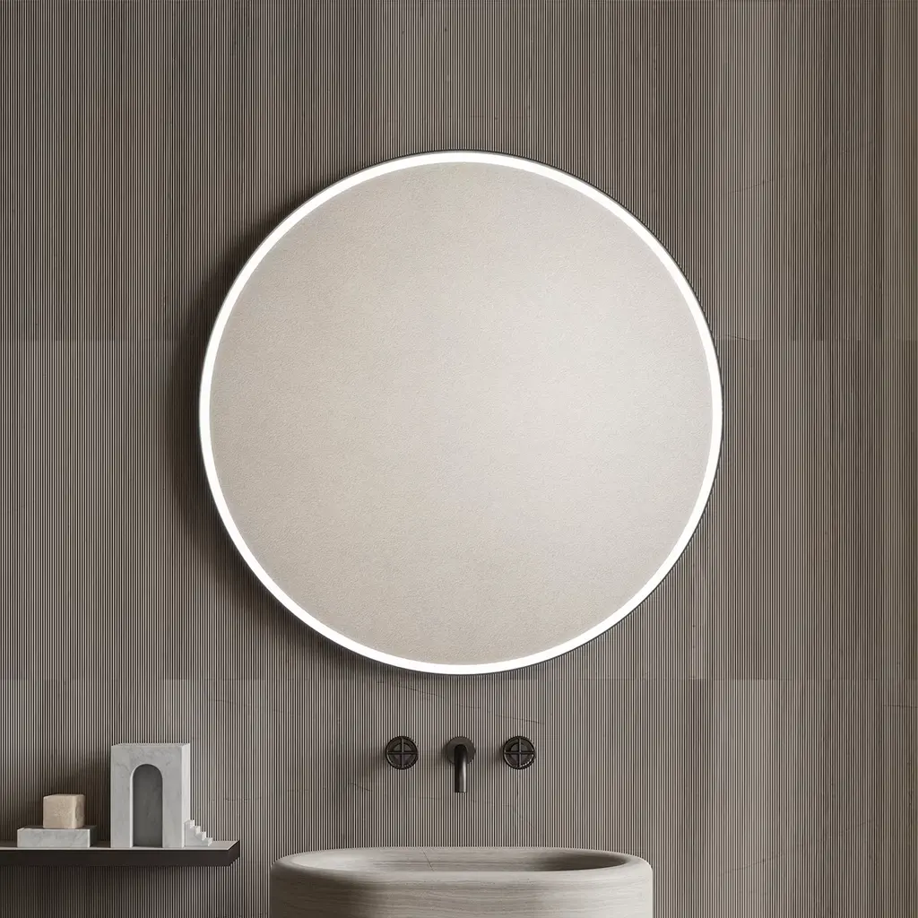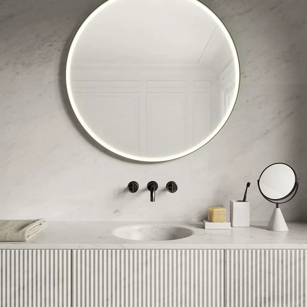 Designed to pair with Elisa's Balnea Bathroom Line, the Mirari Mirror is a pure and simple piece for any contemporary bathroom. Shown here in the round version, the mirror is framed with soft LED lighting for perfect illumination. Also available in an oval shape.