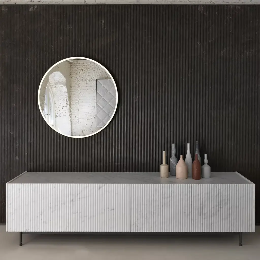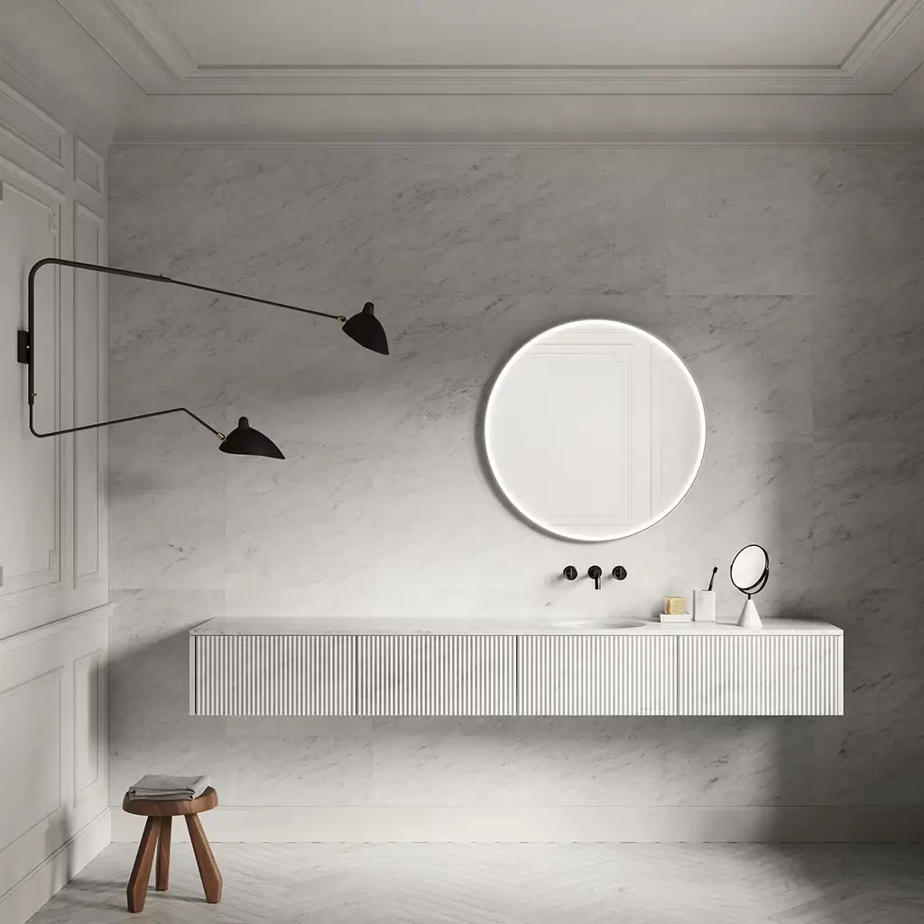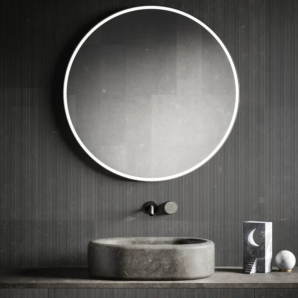 Designed to pair with Elisa's Balnea Bathroom Line, the Mirari Mirror is a pure and simple piece for any contemporary bathroom. Shown here in the round version, the mirror is framed with soft LED lighting for perfect illumination. Also available in an oval shape.