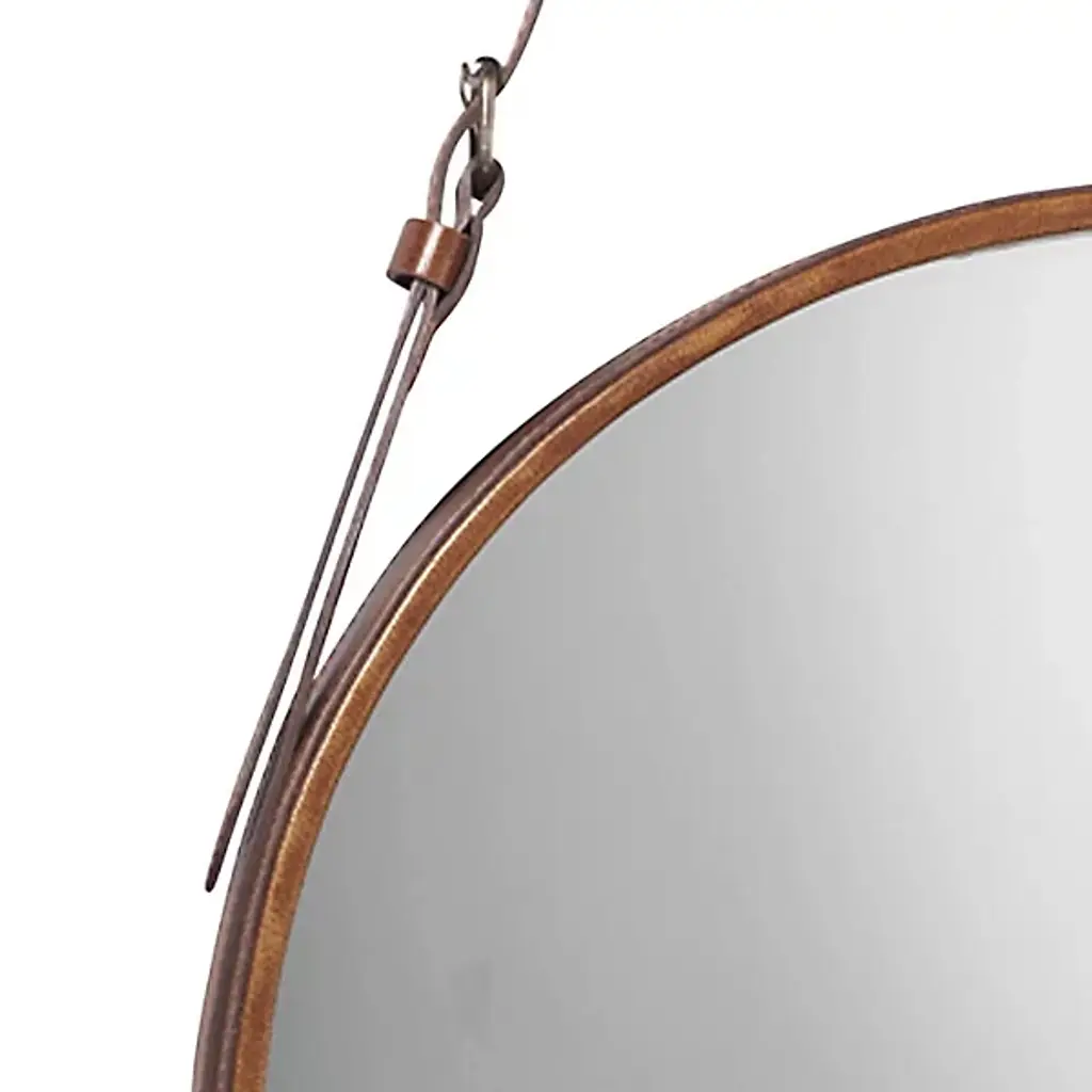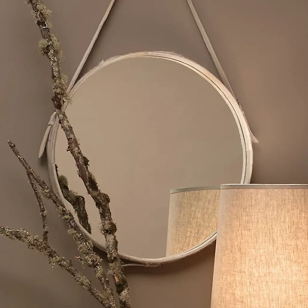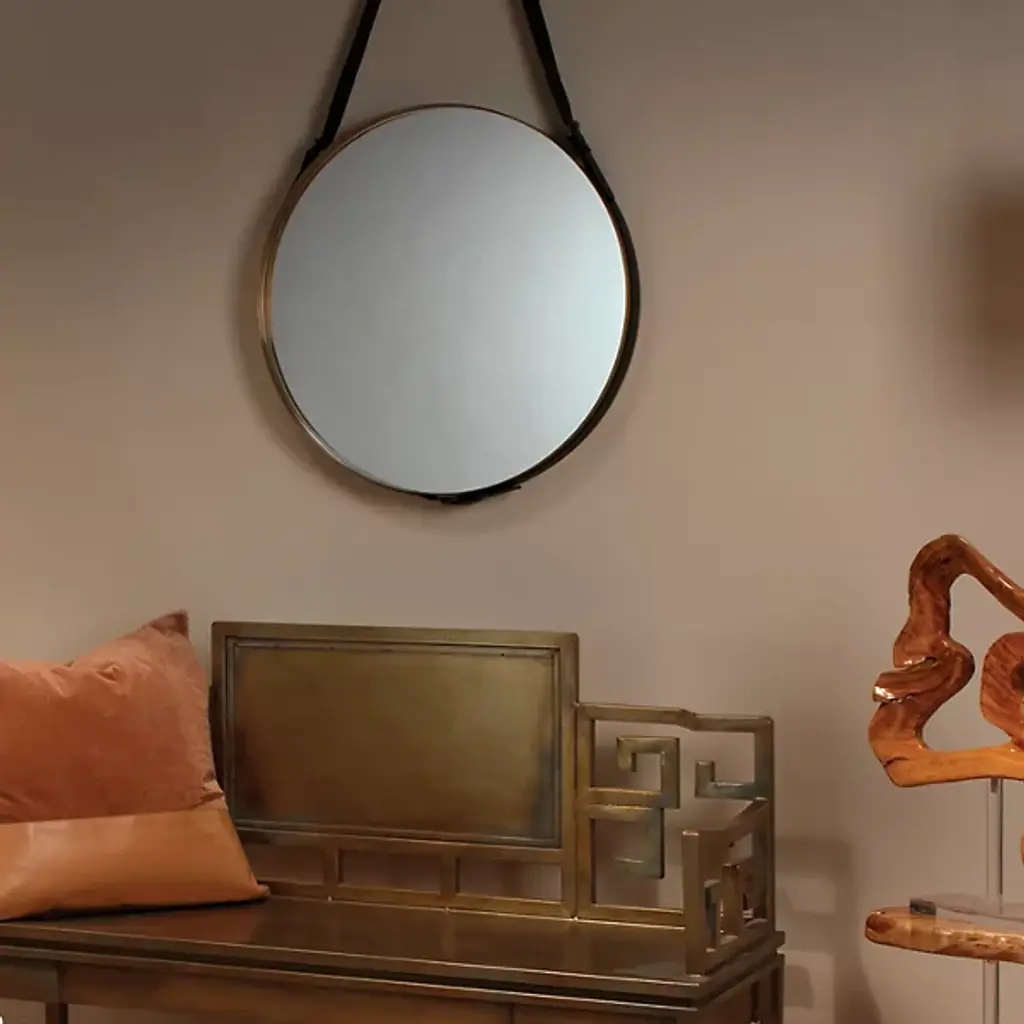 The Round Mirror from Jamie Young Co. is a handsome and strapping piece, incorporating elements of enduring fashion. The precision in its silhouette complements the clean home aesthetic. It creates great intrigue by suspending from a rod via non-adjustable hanging straps. These straps wrap around an elegant ring frame with bold buckle accents. Inside the ring frame rests a crisp mirror offering a brilliant reflection.