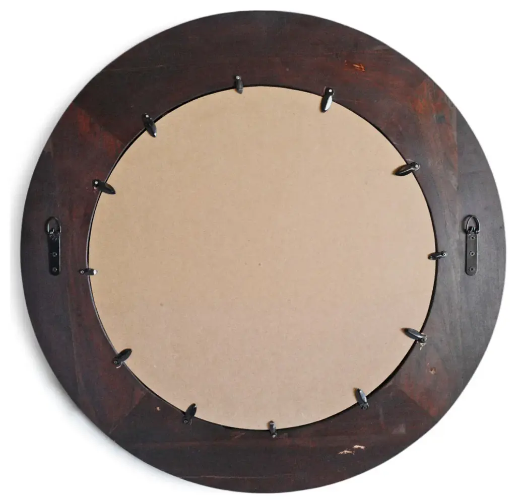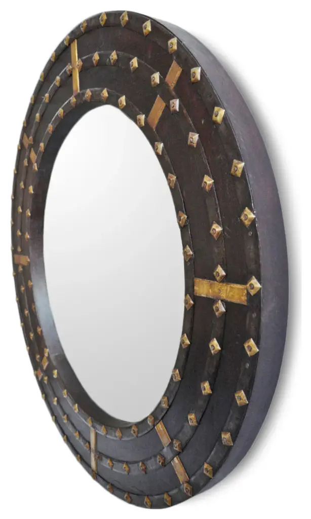 Solid ox cart style round mirror with iron and brass details. Interesting port hole shape. Ready to hang with two iron hooks attached to back. Each mirror will have variations in exact patina/finish, wood grain, and natural imperfections.