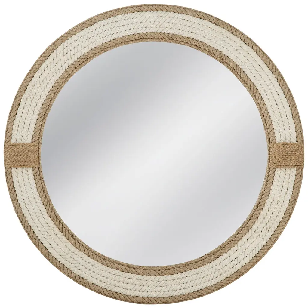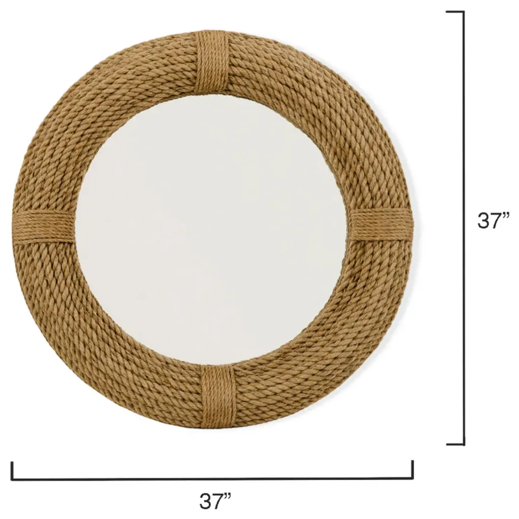 Add a nautical touch to coastal-inspired homes. Hand-wrapped in natural jute rope this mirror provides a spectrum of sunny neutrals while offering a timeless look to any room. •Hand-wrapped of 100% Jute Rope•Non beveled glass mirror•Hangs vertical only•Nautical DesignThe inherent variations in tone and texture of natural Jute are preserved, to create pieces rich in detail and natural beauty. These unique imperfections give our products character and individuality, with each piece having its own personality. We"™ve done our best to represent product as closely as possible; however, different lighting and settings in photography, phone or computer settings may slightly affect color and appearance. •Mirror Surface: 25""H x 25""W•D-Loop Hanging Mechanism•Frame: 7"" W•MDF BackingCare Instructions: Wipe frame with a soft, dry cloth. Wipe glass with standard glass cleaner. DO NOT use cleaners or abrasives on mirror frame.