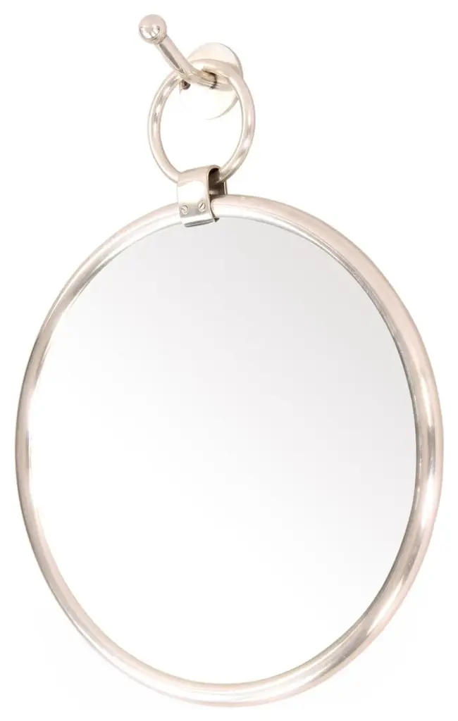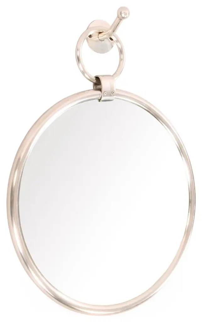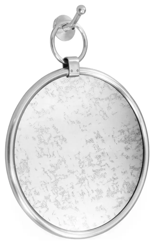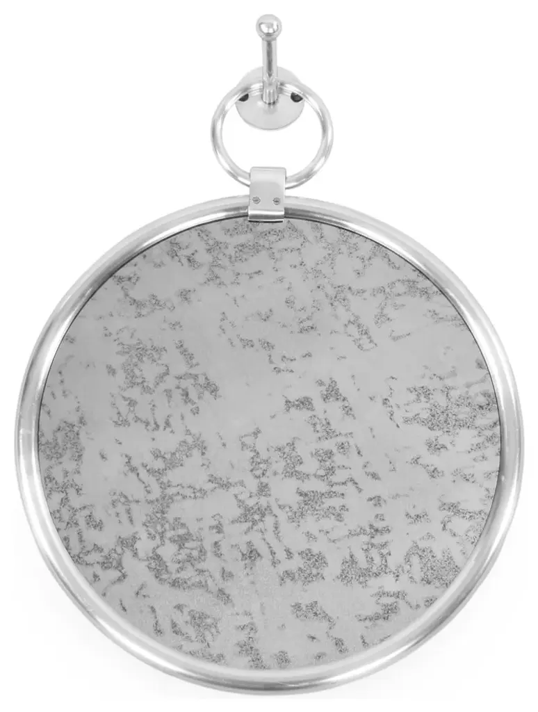 Round double-faced mirror BONDI in antiqued silver. One side shows a regular mirror, the other side is antiqued silver glass mirror. Complete with silvered hook.