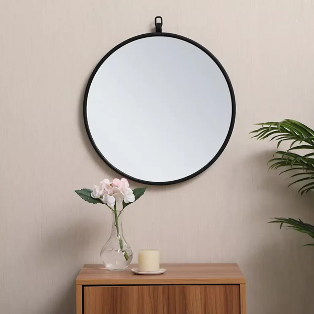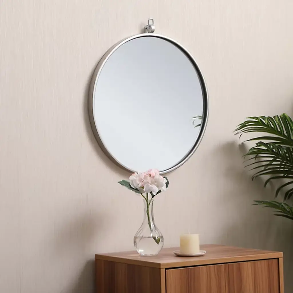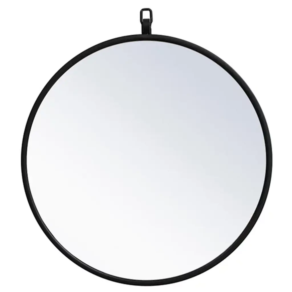 Add a touch of modern elegance to your home or office with the Rowan Round Wall Mirror with Decorative Hook from Elegant Lighting in a subtly antiqued silver finish. Its thin, rounded metal edges and deep profile showcase a sleek, minimalist design. For secure hanging, a sturdy metal hanger ring is welded to the back, ensuring easy installation and enhanced safety.