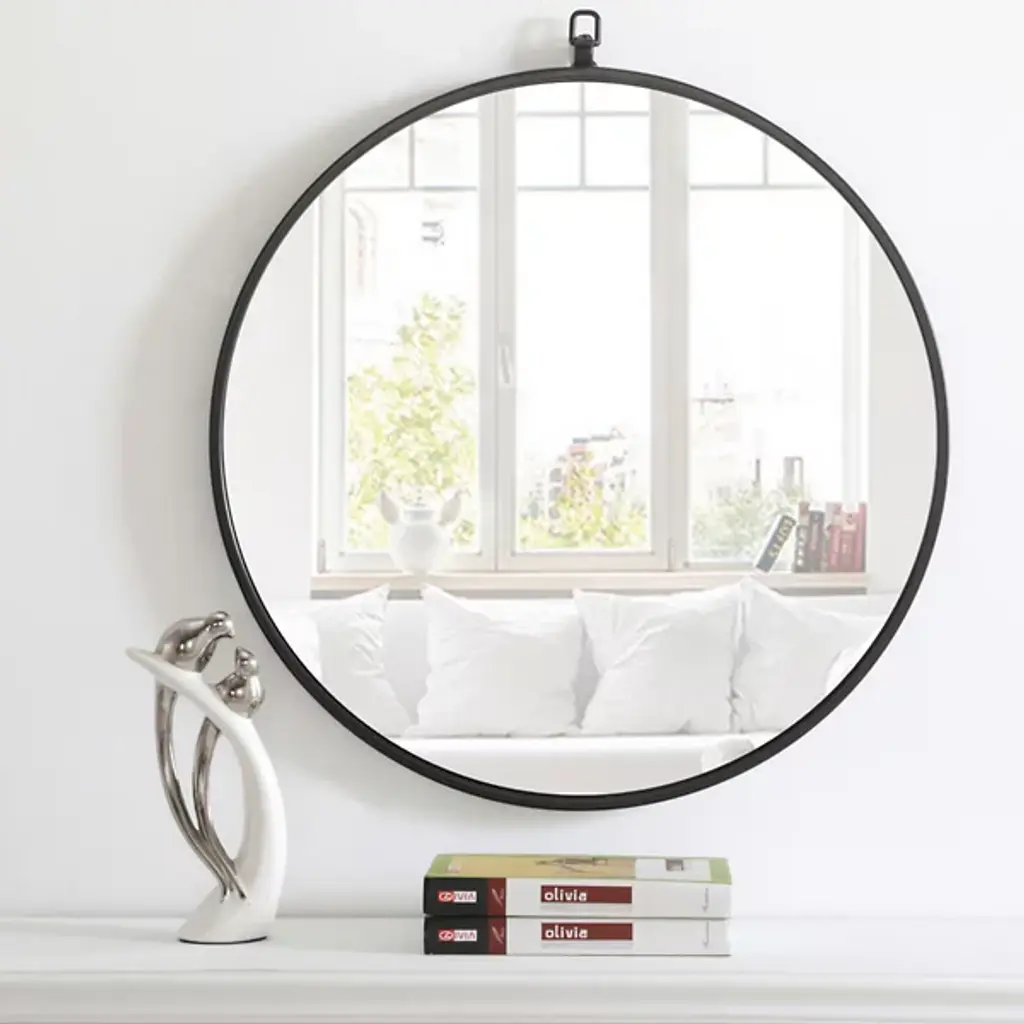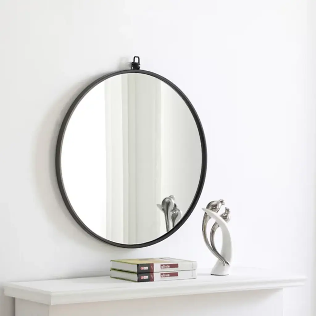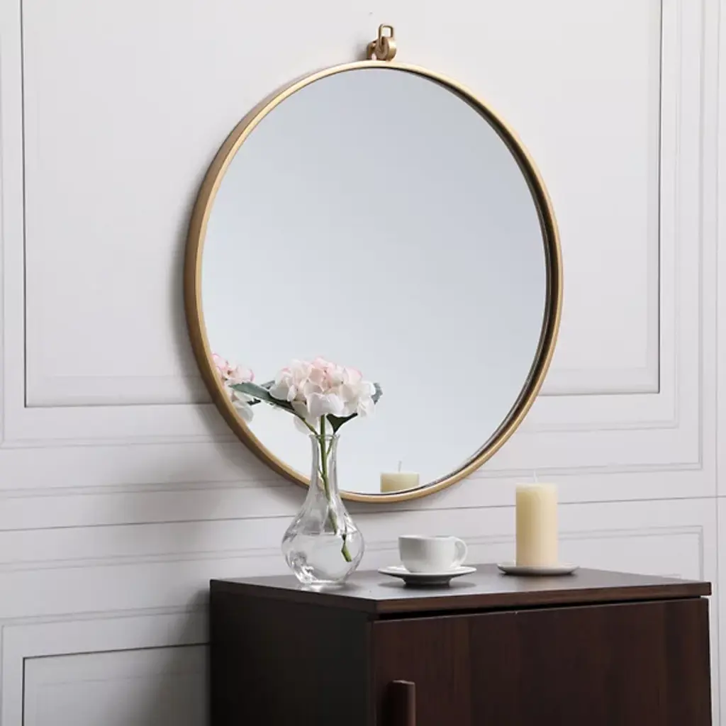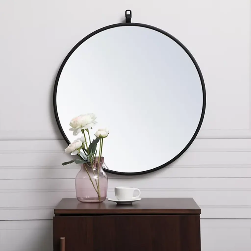 Add a touch of modern elegance to your home or office with the Rowan Round Wall Mirror with Decorative Hook from Elegant Lighting in a subtly antiqued silver finish. Its thin, rounded metal edges and deep profile showcase a sleek, minimalist design. For secure hanging, a sturdy metal hanger ring is welded to the back, ensuring easy installation and enhanced safety.