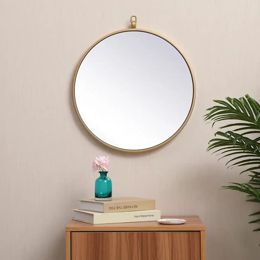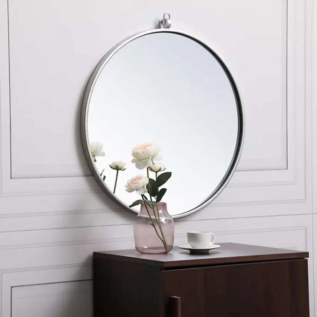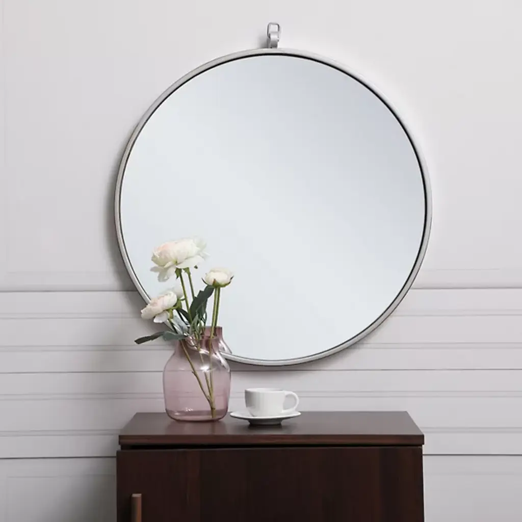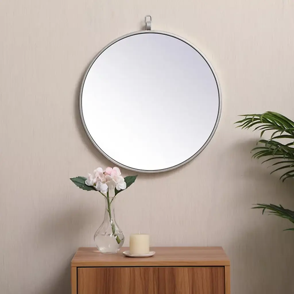 Add a touch of modern elegance to your home or office with the Rowan Round Wall Mirror with Decorative Hook from Elegant Lighting in a subtly antiqued silver finish. Its thin, rounded metal edges and deep profile showcase a sleek, minimalist design. For secure hanging, a sturdy metal hanger ring is welded to the back, ensuring easy installation and enhanced safety.