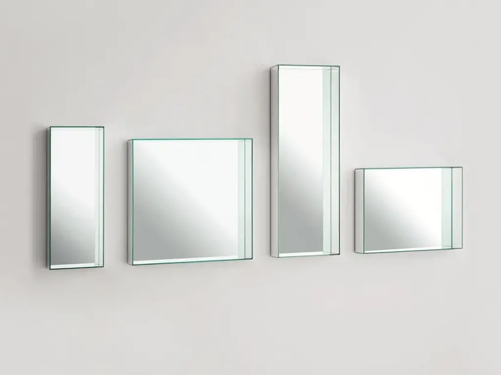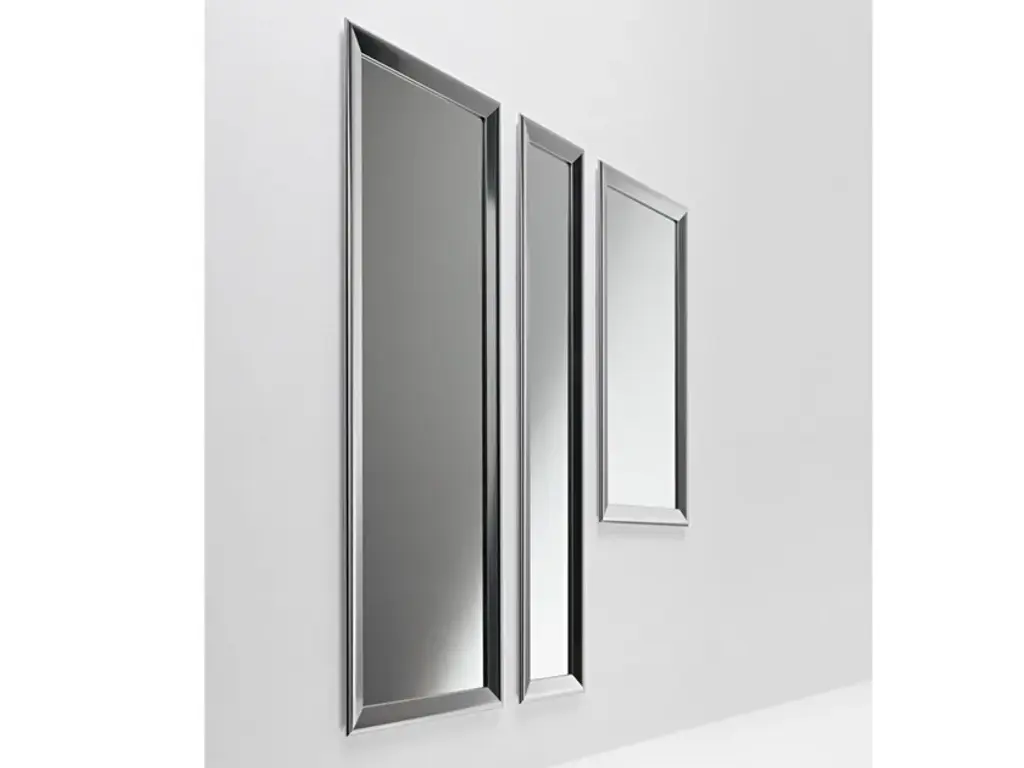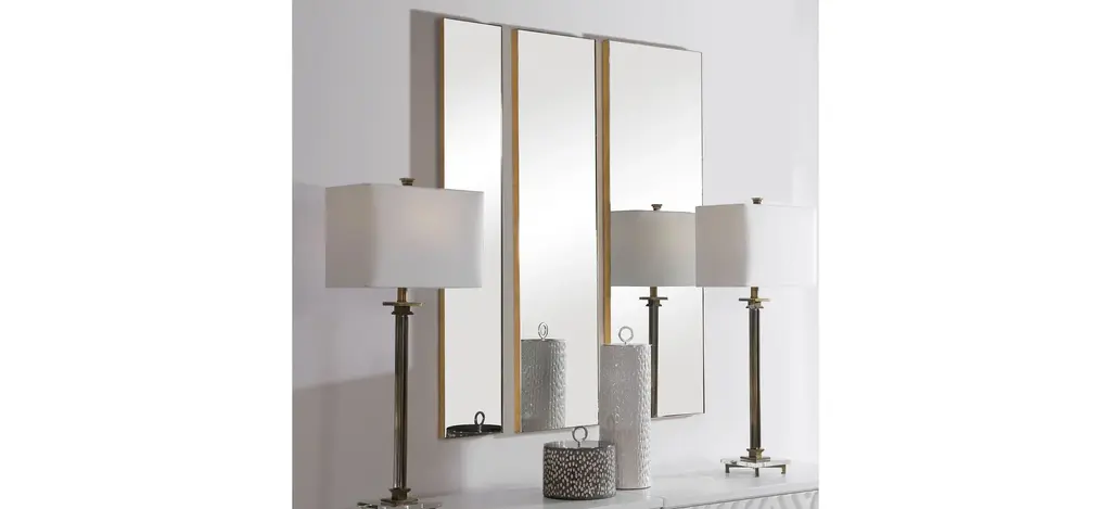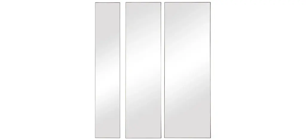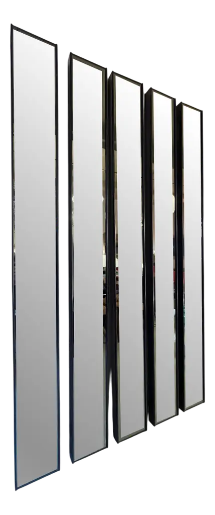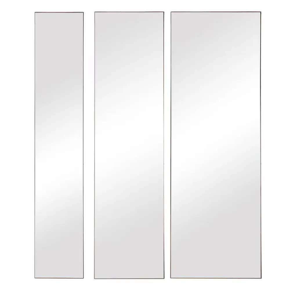 This set of three mirrors showcase simple, clean lines with gold leaf finished metal profile frames. Each mirror may be hung horizontal or vertical, allowing for multiple modern display options. Sizes: S8"x47", M-12"x47", L-16"x47"