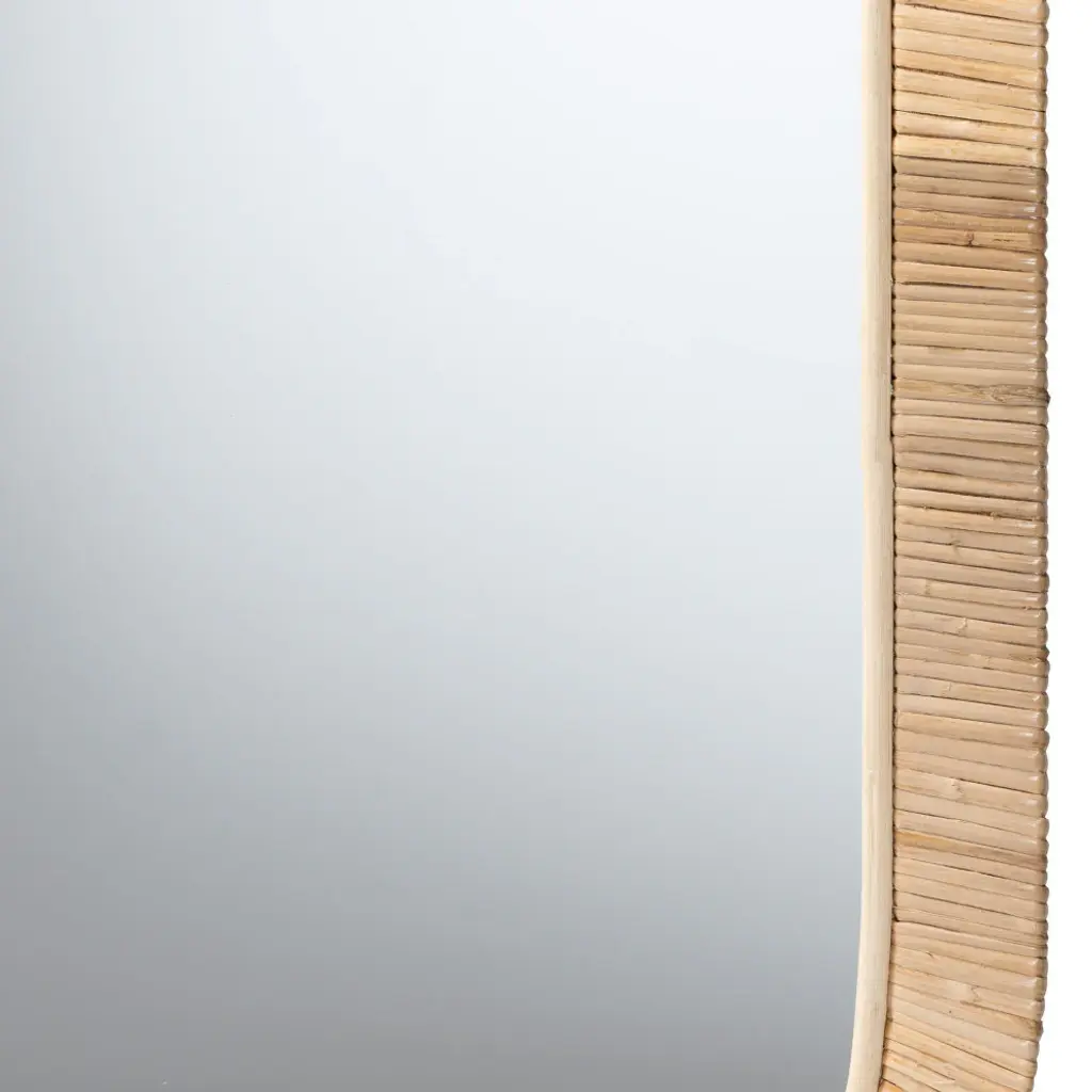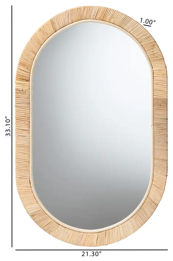 Spruce up your interior with the exotic tones of the Ruby mirror. Made in Indonesia, this bohemian piece consists of a large central mirror within a wood frame wrapped in natural rattan. The oval silhouette adds a touch of smooth geometry to your space and draws attention to the intricately woven rattan. The Ruby will arrive fully assembled and is wall-mountable. Imbuing your space with a soothing aura, the Ruby mirror is sure to refresh any layout.Due to the nature of the natural materials used in this product, it may have variations in areas such as, but not limited to, color, pattern, grain and texture. The hair-like strands of rattan/rattan-fiber are common due to nature of the material.