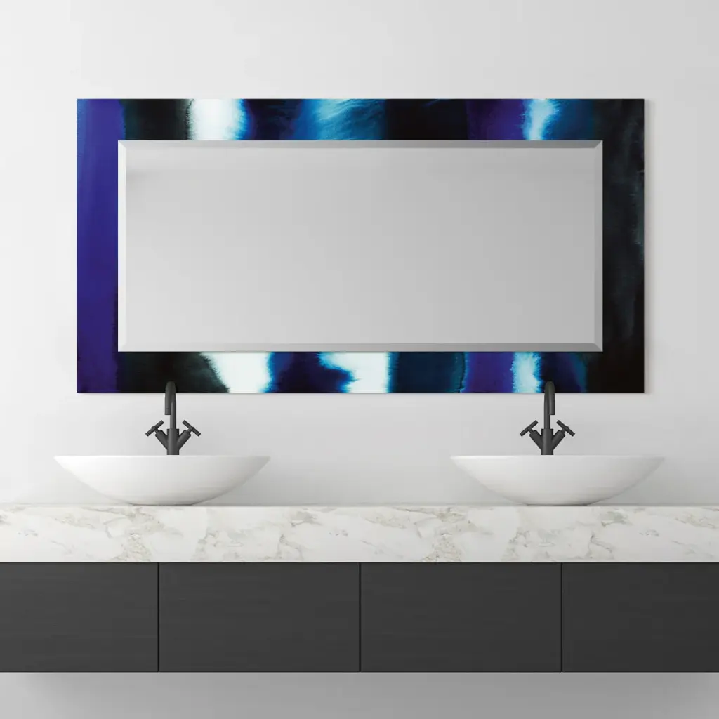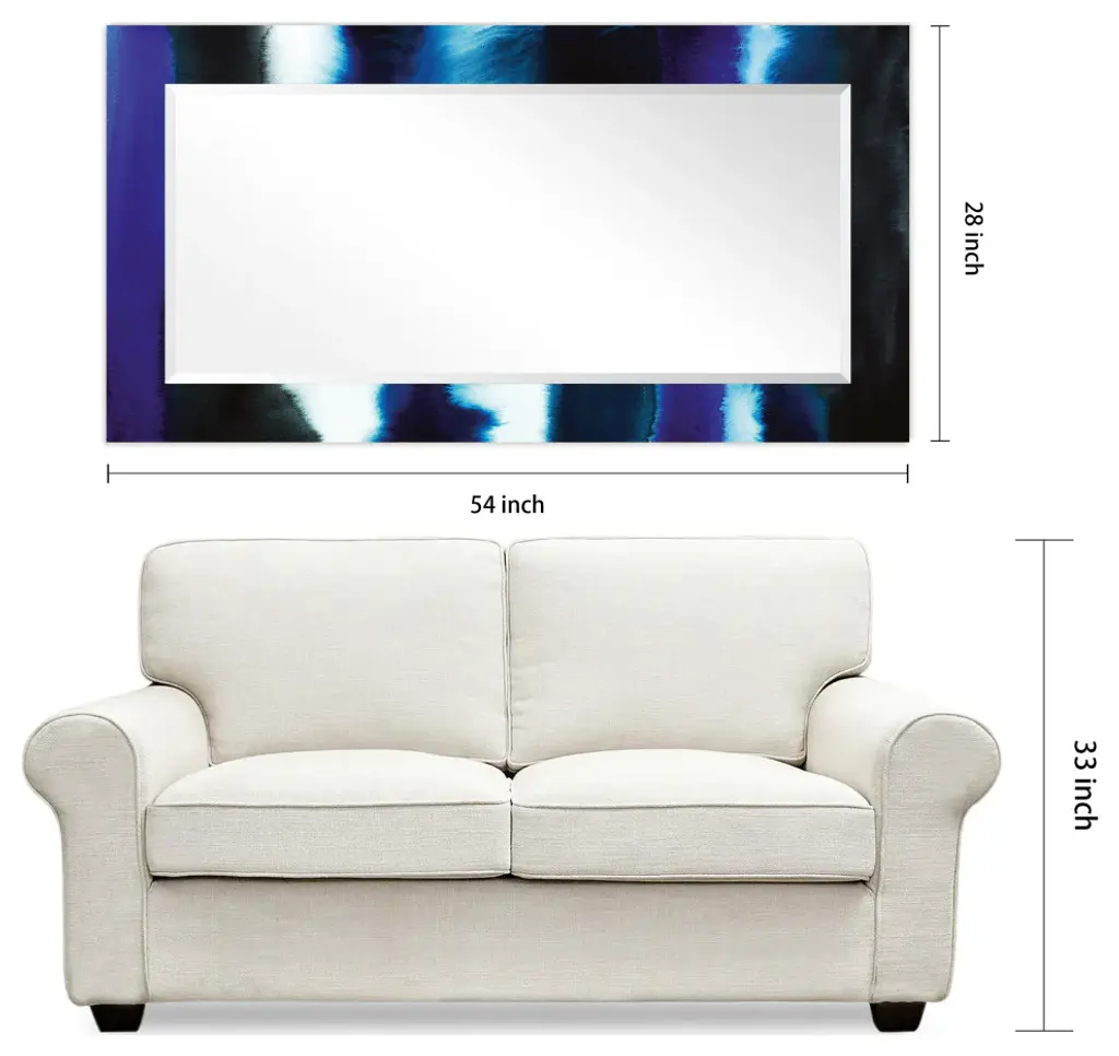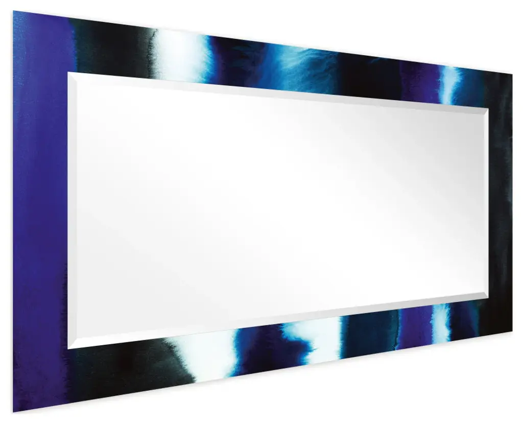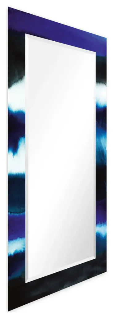 Empire Art Direct"™s collection of printed, frame-less, free floating, tempered glass was inspired by the French technique of Verre Eglomise in which artist''s literally painted the back of clear glass so that when viewed from the front the painting is brought to life under the depth of the glass. This incredible piece by Grace Popp takes that same tempered glass and displays a beveled mirror, centered in front of a beautiful blue, black and white abstract. 4 strong steel hangers are attached to the back of the mirror for a quick and easy vertical or horizontal installation.