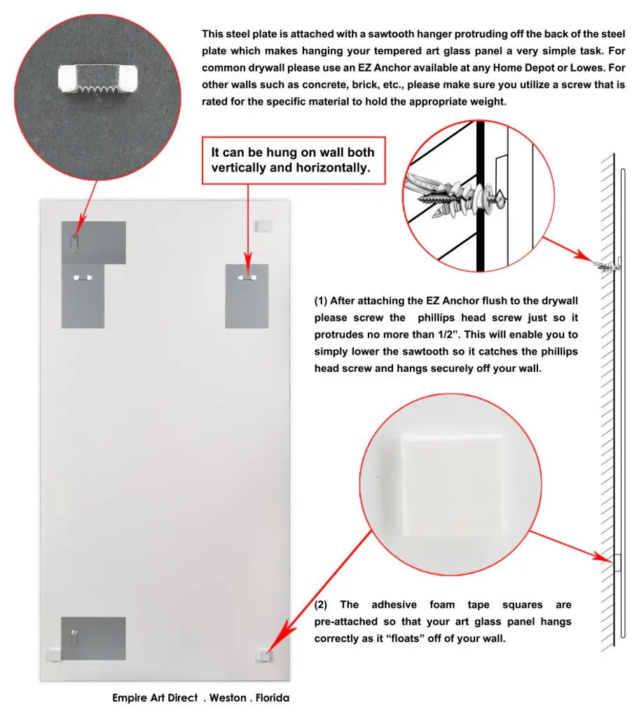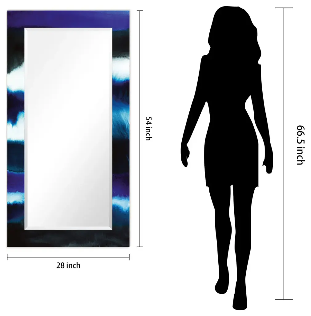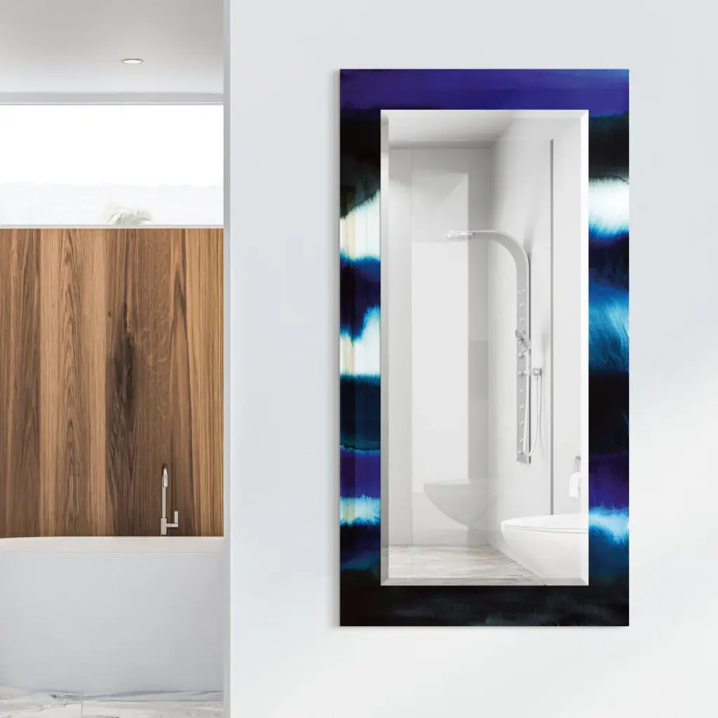 Empire Art Direct"™s collection of printed, frame-less, free floating, tempered glass was inspired by the French technique of Verre Eglomise in which artist''s literally painted the back of clear glass so that when viewed from the front the painting is brought to life under the depth of the glass. This incredible piece by Grace Popp takes that same tempered glass and displays a beveled mirror, centered in front of a beautiful blue, black and white abstract. 4 strong steel hangers are attached to the back of the mirror for a quick and easy vertical or horizontal installation.