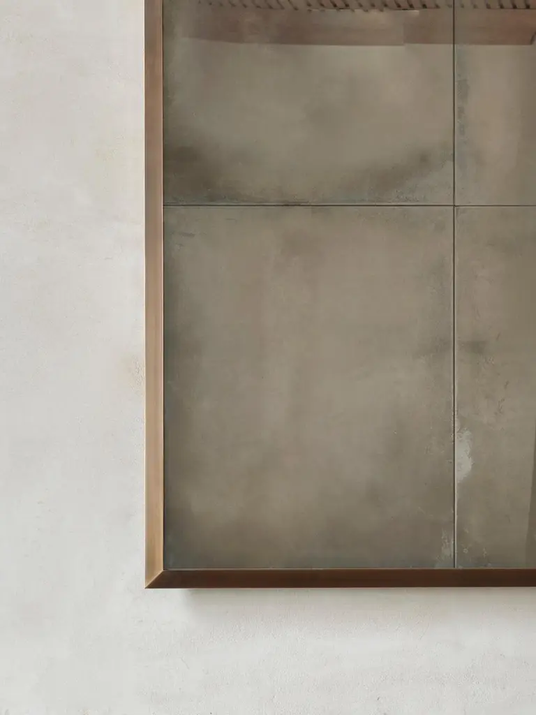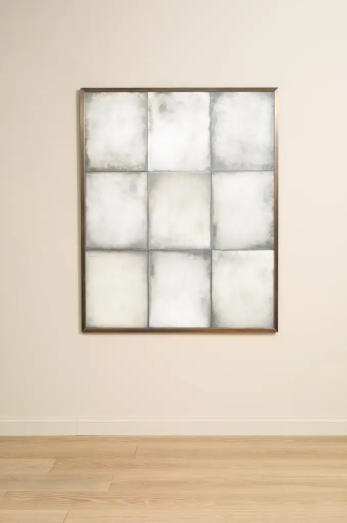 The Braque Overmantel Mirror features a patinated brass angle frame with nine lightly antiqued mirror glass panels.Handcrafted in our Shropshire Workshops, each mirror is made with hidden split batten wall fixings.