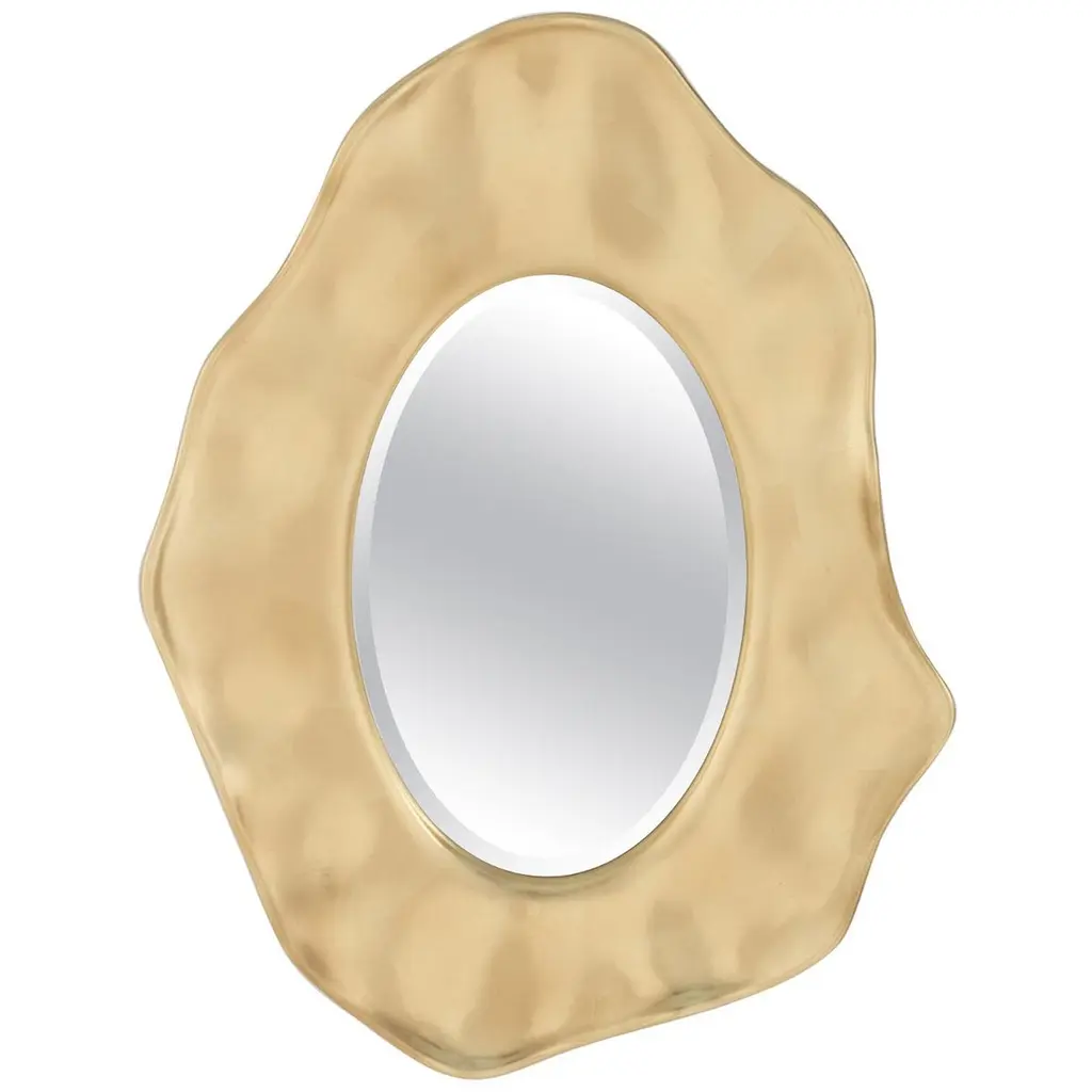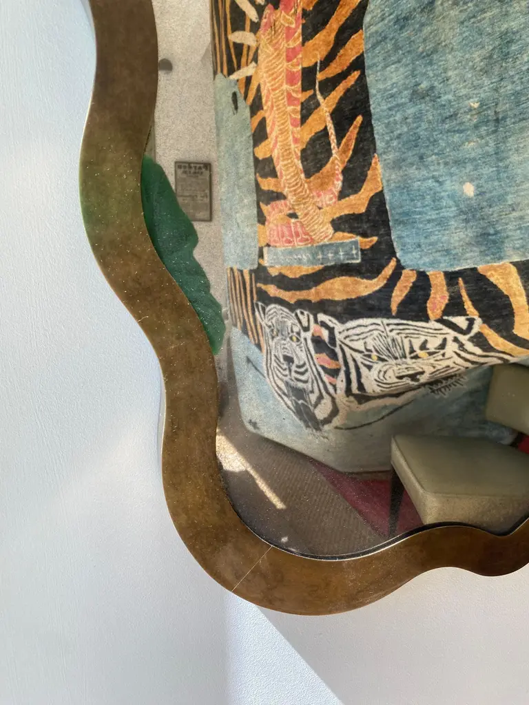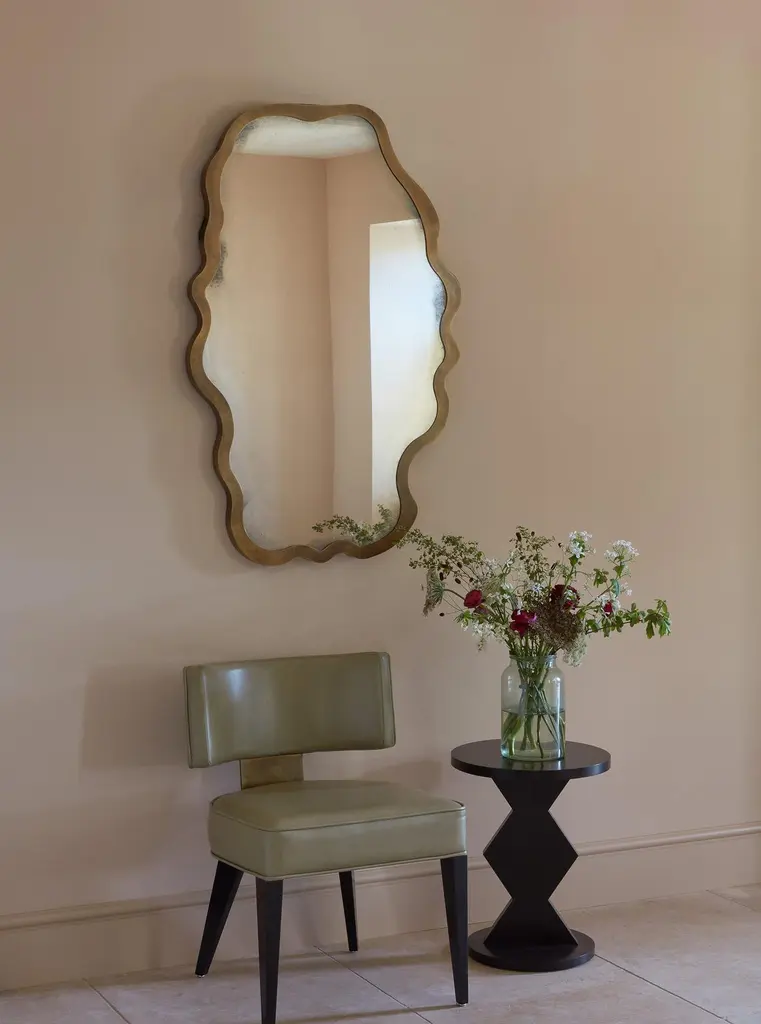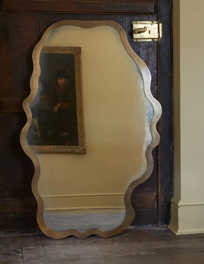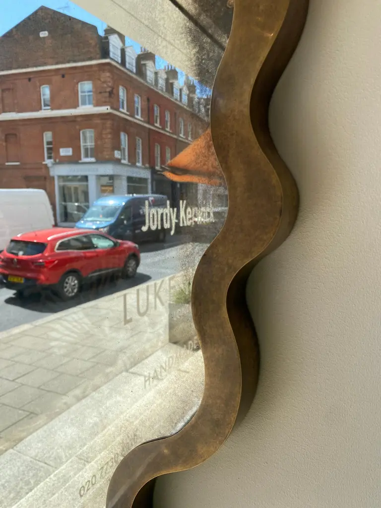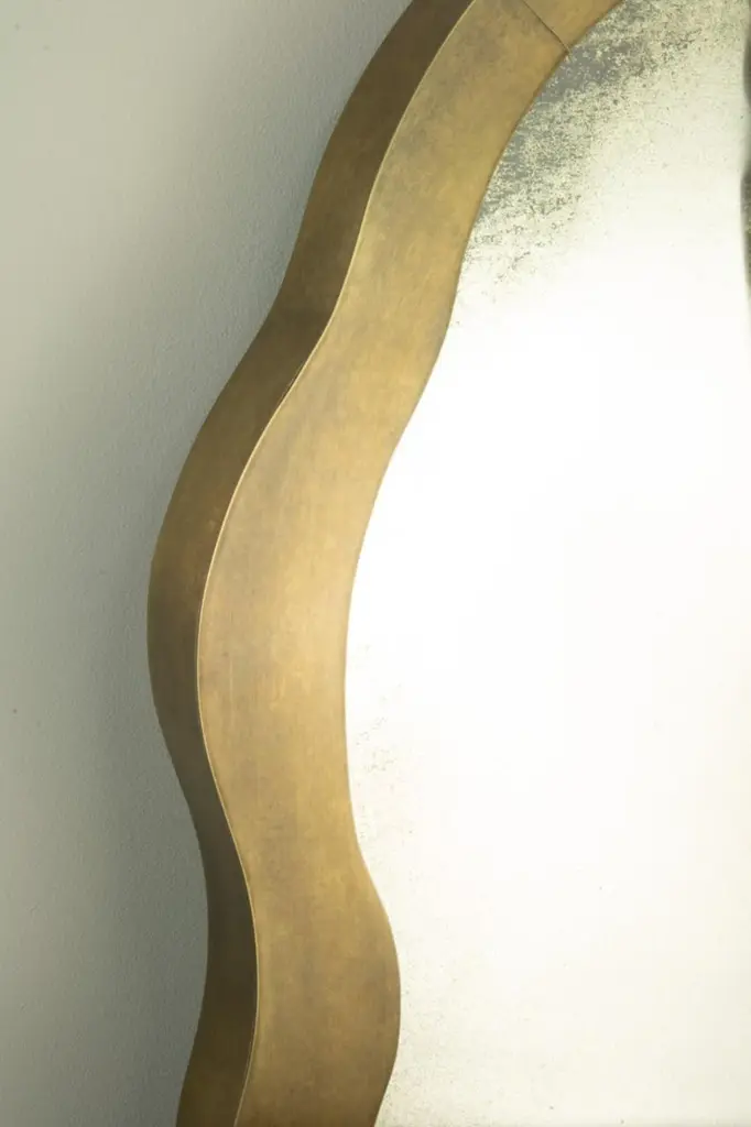Featuring a ‘wavy’ brass frame wrapped around an antiqued mirror glass centre.