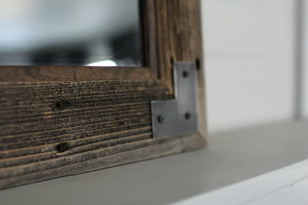 Montana Mirror - Industrial Style with Metal Corner BracketsHandmade in the USA, and available in several sizes, including custom sizes, this rustic mirror will highlight any rustic or casual decor. This mirror is great over the mantel or across from windows to enhance the light in a room. Don''t have a mantelpiece? Try hanging this frame over your favorite leather couch as a point of interest in the room. The metal corner brackets add a little extra industrial flair to tie in other modern decor. D-ring hanging hardware is included with each mirror allowing you to decide whether to hang it horizontally or vertically.Custom orders for our rustic barnwood mirrors are available. Contact us at 888-653-22576 for pricing on a custom size mirror.Mirror sizes are listed according to exterior dimensionsFrame width is 3.5 inches, depth is .75 inchMetal corner bracketsShips Via FedEx in 2 - 3 weeksHandcrafted in USA• • • PLEASE NOTE: Due to the nature of reclaimed wood, your completed frame''s colors, textures, knots, and grains may vary slightly from the one you see pictured here. Each and every piece is one-of-a-kind which adds to the charm and character of your finished mirror frame.