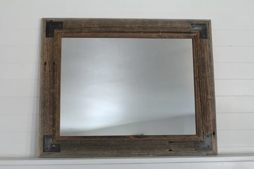 Montana Mirror - Industrial Style with Metal Corner BracketsHandmade in the USA, and available in several sizes, including custom sizes, this rustic mirror will highlight any rustic or casual decor. This mirror is great over the mantel or across from windows to enhance the light in a room. Don''t have a mantelpiece? Try hanging this frame over your favorite leather couch as a point of interest in the room. The metal corner brackets add a little extra industrial flair to tie in other modern decor. D-ring hanging hardware is included with each mirror allowing you to decide whether to hang it horizontally or vertically.Custom orders for our rustic barnwood mirrors are available. Contact us at 888-653-22576 for pricing on a custom size mirror.Mirror sizes are listed according to exterior dimensionsFrame width is 3.5 inches, depth is .75 inchMetal corner bracketsShips Via FedEx in 2 - 3 weeksHandcrafted in USA• • • PLEASE NOTE: Due to the nature of reclaimed wood, your completed frame''s colors, textures, knots, and grains may vary slightly from the one you see pictured here. Each and every piece is one-of-a-kind which adds to the charm and character of your finished mirror frame.
