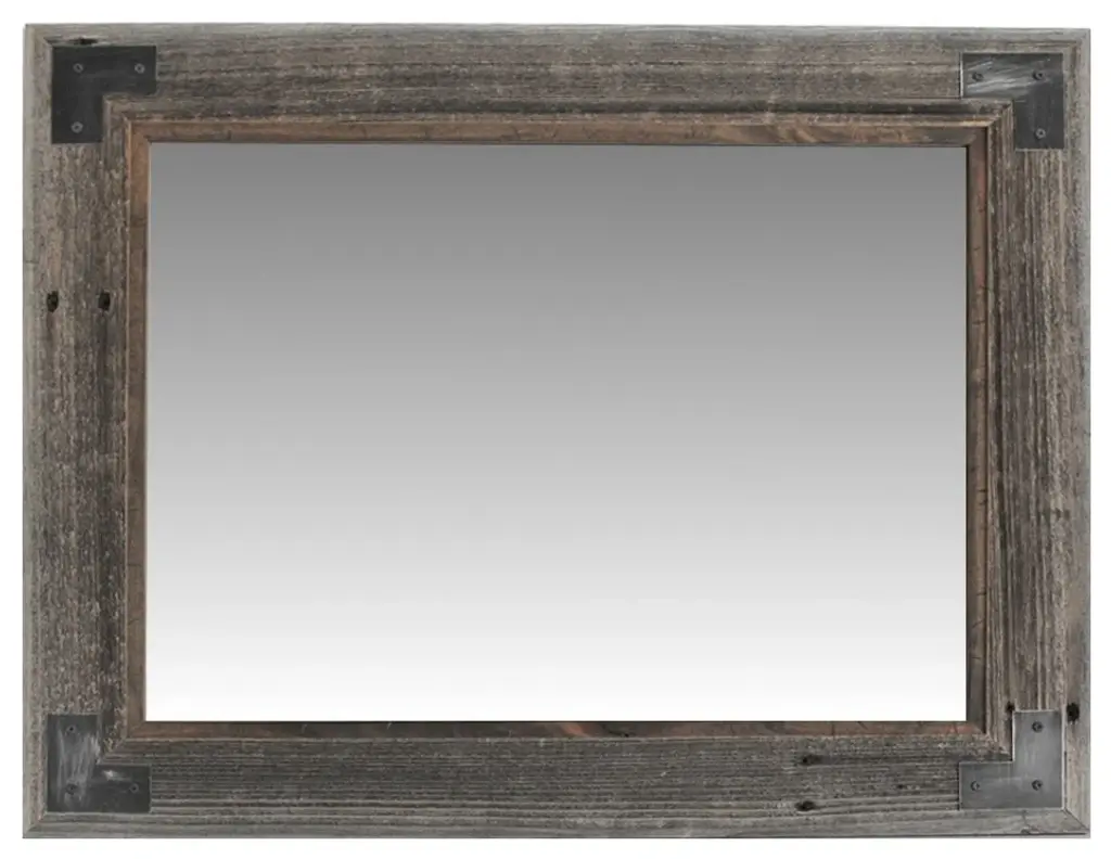 Montana Mirror - Industrial Style with Metal Corner BracketsHandmade in the USA, and available in several sizes, including custom sizes, this rustic mirror will highlight any rustic or casual decor. This mirror is great over the mantel or across from windows to enhance the light in a room. Don''t have a mantelpiece? Try hanging this frame over your favorite leather couch as a point of interest in the room. The metal corner brackets add a little extra industrial flair to tie in other modern decor. D-ring hanging hardware is included with each mirror allowing you to decide whether to hang it horizontally or vertically.Custom orders for our rustic barnwood mirrors are available. Contact us at 888-653-22576 for pricing on a custom size mirror.Mirror sizes are listed according to exterior dimensionsFrame width is 3.5 inches, depth is .75 inchMetal corner bracketsShips Via FedEx in 2 - 3 weeksHandcrafted in USA• • • PLEASE NOTE: Due to the nature of reclaimed wood, your completed frame''s colors, textures, knots, and grains may vary slightly from the one you see pictured here. Each and every piece is one-of-a-kind which adds to the charm and character of your finished mirror frame.