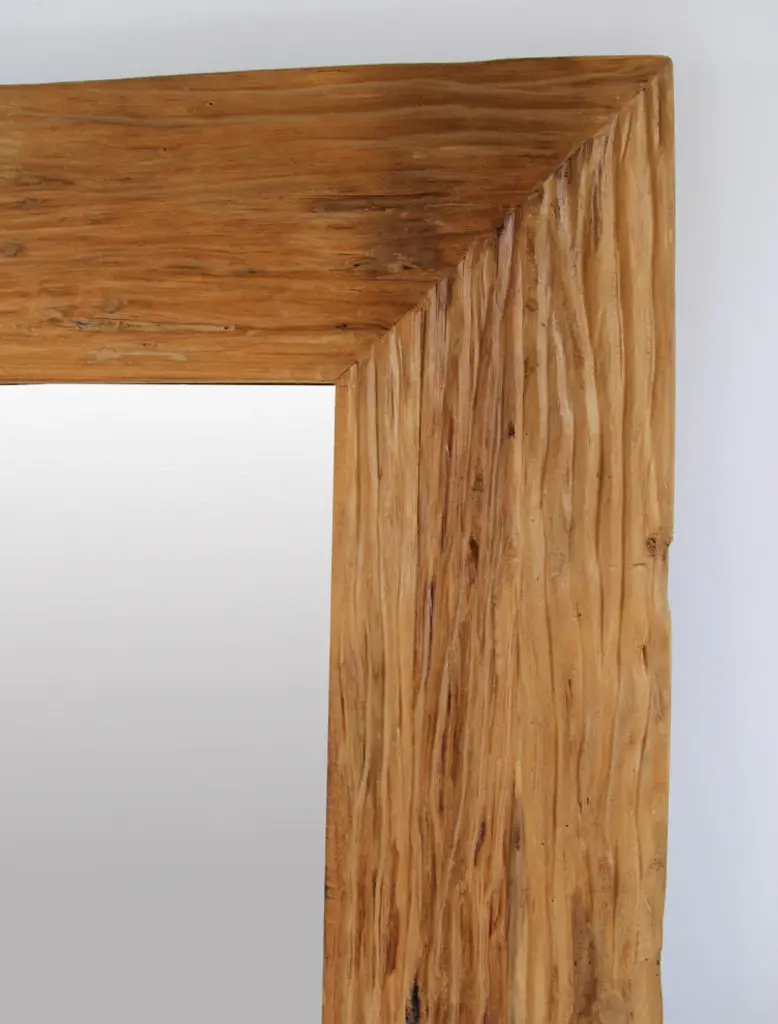Rustic reclaimed railroad tie wood with sanded deep grain made into a beautiful mirror frame. Natural wood finish. Each mirror will vary in exact wood tones, grain, and natural imperfections.