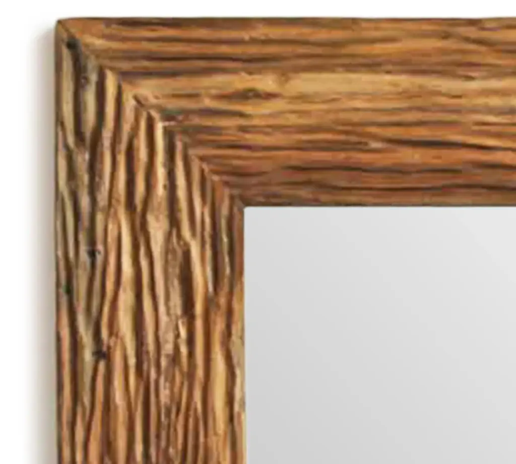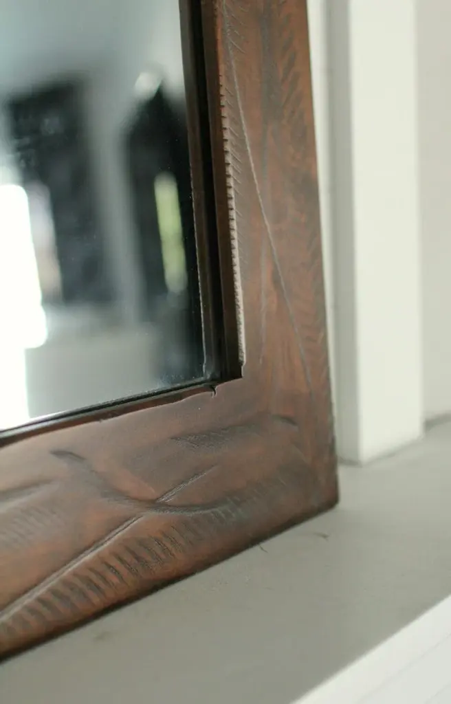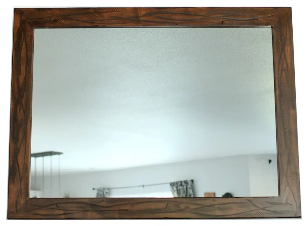 Sedona Style Rustic Mirror with Heavy DistressingThis beautifully-crafted rustic wood mirror features a natural alder wood frame with rich walnut stain and a dark glaze that highlights the texture and color tones in the heavily-distressed wood frame. While this mirror has been greatly distressed, it has a nice finish which keeps it from looking too rough. The Sedona mirror would look wonderful in a log cabin or a modern farmhouse. The distressing gives the wood an aged look and because it is hand-made, no two mirrors are exactly alike. You''ll love knowing you have an original piece.D-ring hanging hardware is included with each mirror allowing you to decide whether to hang it horizontally or vertically. Frame width is 3.5 inches, depth is .75 inchNatural alder woodDark walnut stain with espresso glazeMirror sizes are listed according to exterior dimensionsHandcrafted in USAPLEASE NOTE: Because of the possible variances in computer monitor colors and reclaimed wood colors, your completed frame may vary slightly in color and texture from the one you see pictured here.