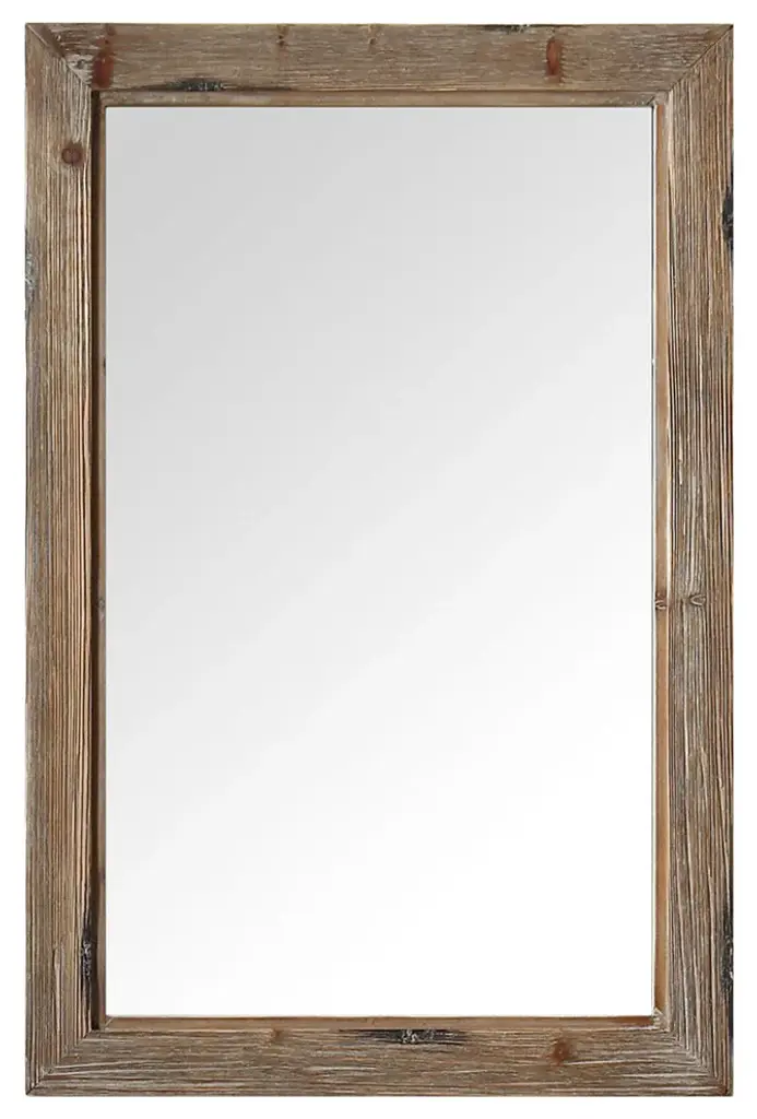 Rustic Mirrors - Reclaimed Barn Wood Mirror with Alder Inset and Nailhead Corner TacksWe''ve taken our popular Hobble Creek frame and turned it into a classic western mirror. We add a 1/2 inch walnut-stained alder inset to a 3 1/2 inch barnwood frame to help draw out the natural tones and textures of the naturally distressed wood. Nail head tacks are added in each corner to enhance the rustic and western charm of this mirror. While it is primarily viewed as a western decor mirror, its simplicity and classic styling make it a great addition to any room. Try it with nautical and farmhouse decor to elevate your interior decorating skills to the next level.D-ring hanging hardware is included with each mirror allowing you to decide whether to hang it horizontally or vertically.Mirror sizes are listed according to exterior dimensionsShips Via FedEx in 2 - 3 weeksHandcrafted in USAPLEASE NOTE: Because of the possible variances in computer monitor colors and reclaimed wood colors, your completed frame may vary slightly in color and texture from the one you see pictured here.
