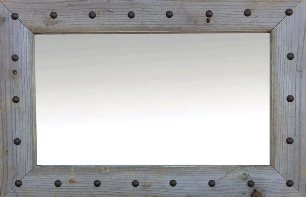 Rustic Mirrors With Country Charm - Bunkhouse Style Barn Wood Mirror with Tacks,18x22 Rustic Mirrors handcrafted from natural barn wood are our specialty. We especially like this unique mirror which features a wide 3.5 inch barnwood frame face. We've added distressed nail-head tacks all the way around the outside of the wood frame, which makes this a unique-looking mirror that adds character and charm to your western rustic or primitive decor. The mirror's exterior dimensions are 18x22 inches, and you can hang your mirror either horizontally or vertically. This mirror can be manufactured in custom sizes. Please call 888-OLD-BARN for a quote.Natural imperfections may occur in this product.