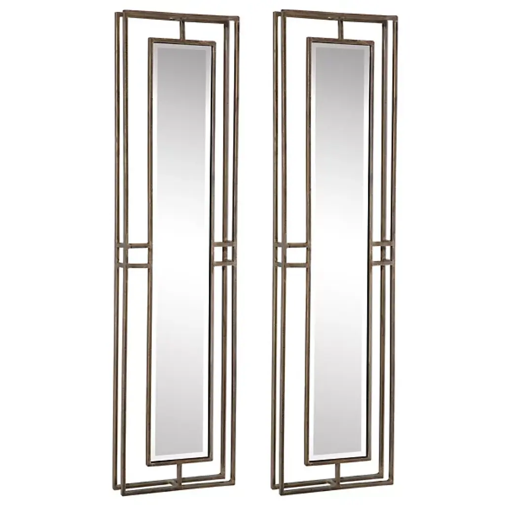 The Rutledge Mirrors, Set of 2 from Uttermost introduce depth through their open-frame design that stands away from the wall. Linear metalwork creates geometric precision, while beveled mirror edges enhance reflective qualities. The duo can be arranged horizontally or vertically, working in tandem or separately to define spaces. Their aged metal frames add substance to the minimalist design approach.