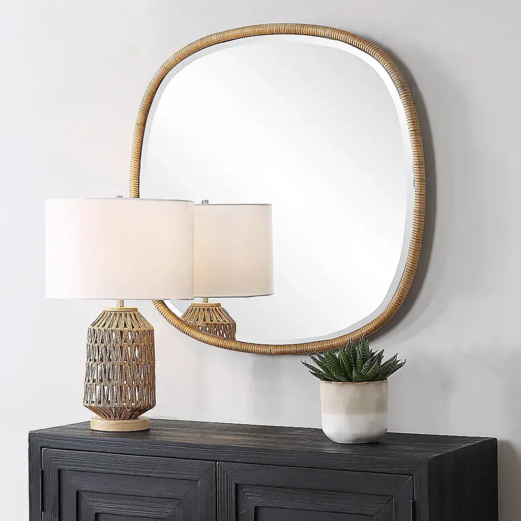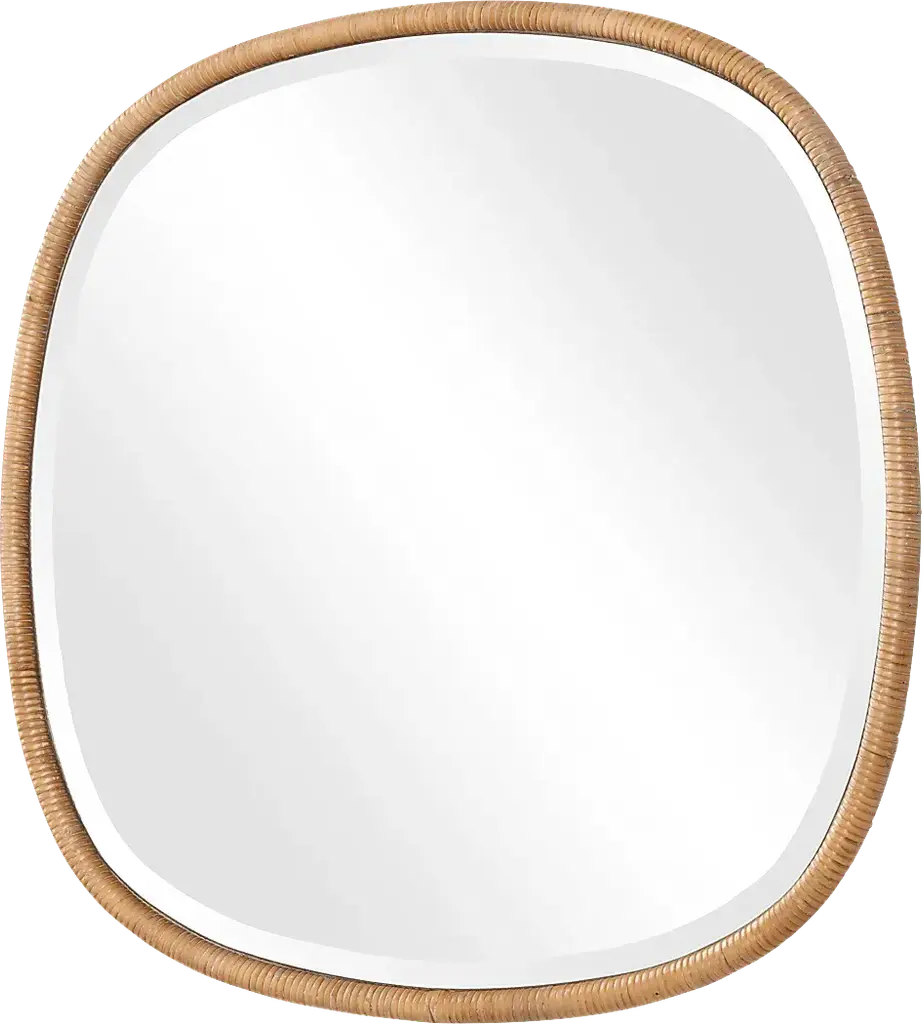 Perfect for a coastal setting, this unique shaped Rymond mirror is wrapped with natural rattan. This updated version of the classic round mirror is 34" and is finished with a .75" bevel.
